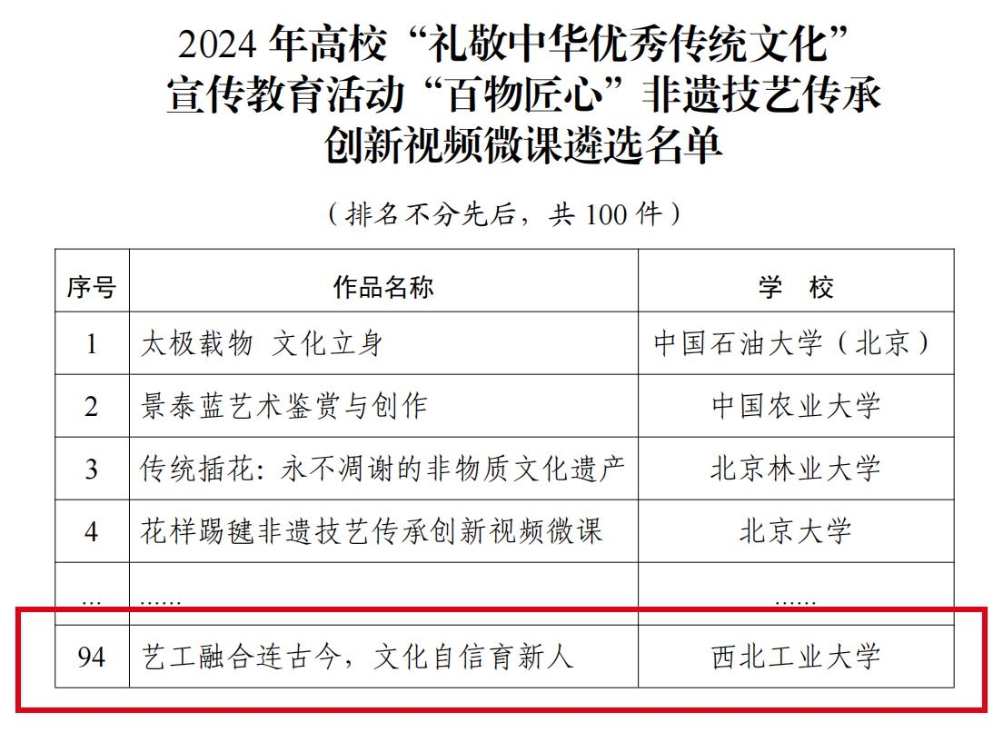 近日,教育部办公厅公布了2024年高校“礼敬中华优秀传统文化”宣传教育活动评选结果。我校党委宣传部联合教务部(工程实践训练中心)报送的《艺工融合连古今,文化自信育新人》入选“百物匠心”非遗技艺传承创新视频微课遴选名单。