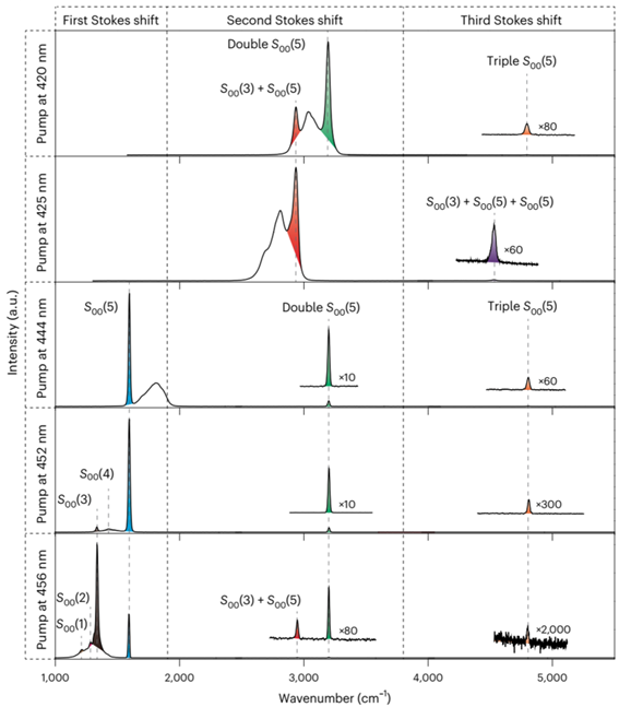 针对这一难题,团队从量子光学与分子振动的协同耦合机制出发,提出受激辐射与拉曼散射共振匹配理论,创制了“光谱调谐增益诱导拉曼激射”新方法,成功地实现了拉曼信号的指数级放大。基于该方法制备的拉曼光学器件展现出超低阈值(20-50 μJ/cm2),比现有主流拉曼激光器降低了4个数量级。拉曼激射信号呈现出超强的能量输出,信噪比达到30分贝以上,并成功地实现了带宽超过110 nm的级联拉曼信号。拉曼光学器件在爆炸物检测方面灵敏度惊人,在亿分之一空气浓度下,二硝基甲苯和三硝基甲苯的检测灵敏度分别达到95%和80%以上。