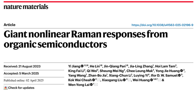 近日,西北工业大学柔性电子研究院、柔性电子全国重点实验室黄维院士团队与新加坡国立大学、香港浸会大学等单位合作,在有机半导体非线性光学研究领域取得里程碑式进展。团队创新性地提出“光谱调谐增益诱导拉曼激射”理论模型,揭示了分子振动与受激辐射共振匹配的核心机制,首次成功地在有机半导体材料中实现拉曼信号的指数级放大和高效多阶拉曼激射,而且无需依赖复杂的光学微腔结构。该研究突破了传统非线性光学理论中“分子振动增益弱、依赖高能量泵浦”的瓶颈,为拓展有机半导体在拉曼激光等非线性光学领域的应用奠定了理论基础,更为发展柔性拉曼激光器、实现高精度传感检测等提供新思路新方法新技术。相关研究以“Giant nonlinear Raman responses from organic semiconductors”为题在线发表于国际顶尖学术期刊《自然·材料》(Nature Materials, 2025, DOI: 10.1038/s41563-025-02196-9)。