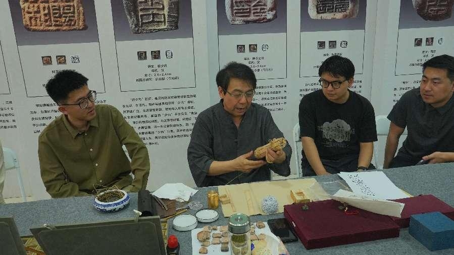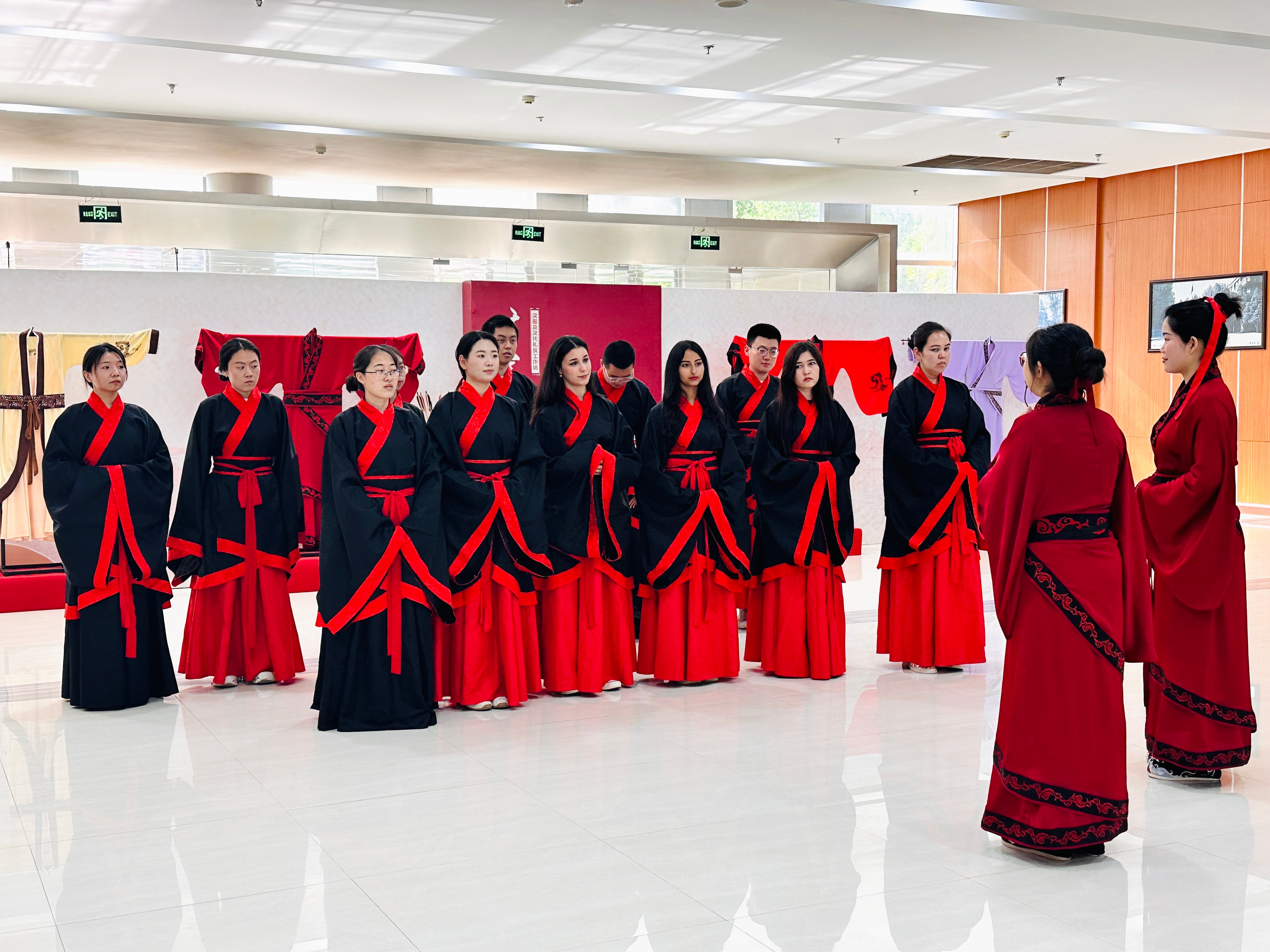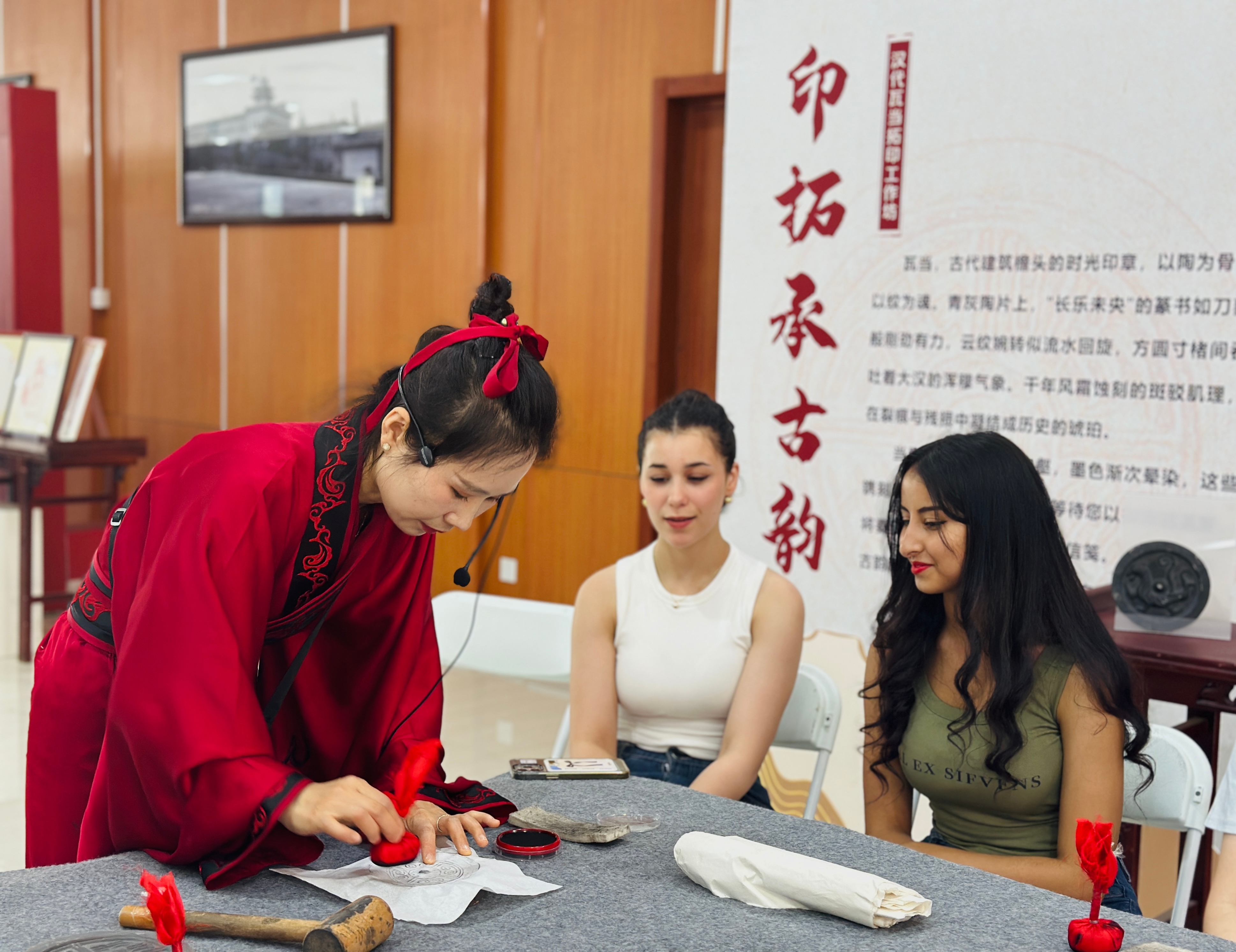在“时空衣冠厅”汉服礼仪体验区,学生们身着曲裾深衣,沉浸于汉代礼仪之美;在“印拓承古韵”瓦当拓印工作坊,亲手拓印“汉代印记”;“传承千年·绘就古韵”壁画工作坊中,色彩与笔触再现盛世风貌;“秦汉封泥的前世今生”工作坊引导学生体验“古代保密技术”;“方寸红纸·锦绣乾坤”剪纸艺术工作坊则让青年在指尖艺术中传承民俗记忆。体验市集以非遗技艺为媒,推动传统艺术与青年表达的双向奔赴,让中华文化“看得见、摸得着、讲得出”。