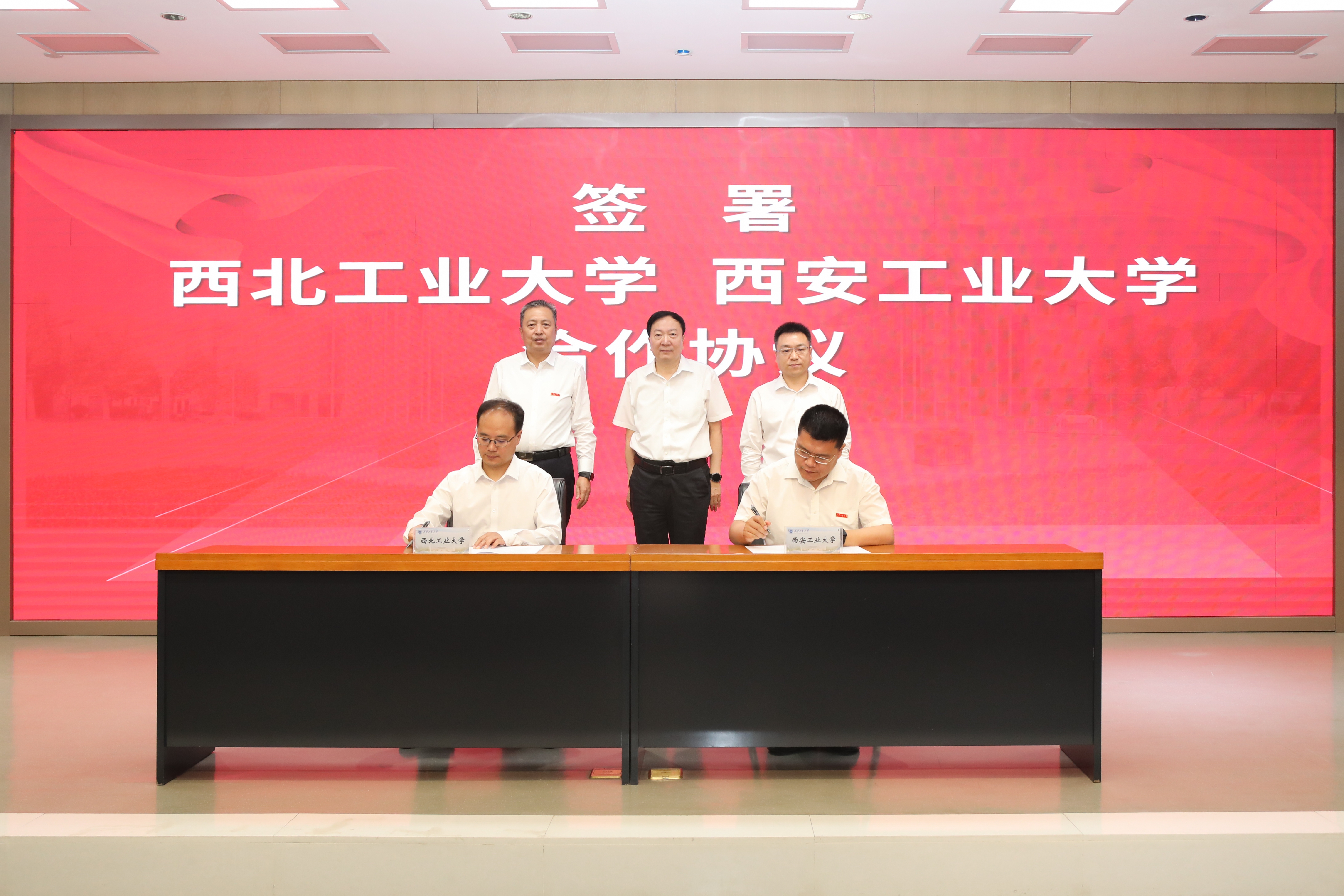 我校副校长王伶与西安工业大学校长姚尧签署合作协议。李言荣,何玉麒,侯成义共同见签。