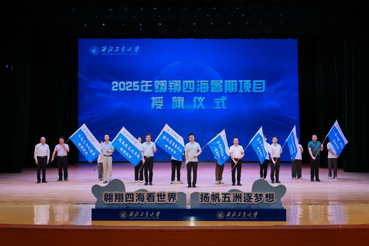 岳晓奎向航天学院、材料学院、电子信息学院、计算机学院、化学与化工学院、艺术教育中心、党委学生工作部相关负责同志授予2025年“翱翔四海”暑期项目主题旗帜,向即将踏上征程的全体同学和带队老师们表示祝贺。他指出“翱翔四海”项目是学校当前实施的本科生“三个一”工程的一项重要抓手,并对同学们提出了三点希望:一是厚植家国情怀,做胸怀天下的自信使者;二是珍惜研学机遇,做知行合一的奋进英才;三是严守纪律规矩,做平安出行的模范标兵。