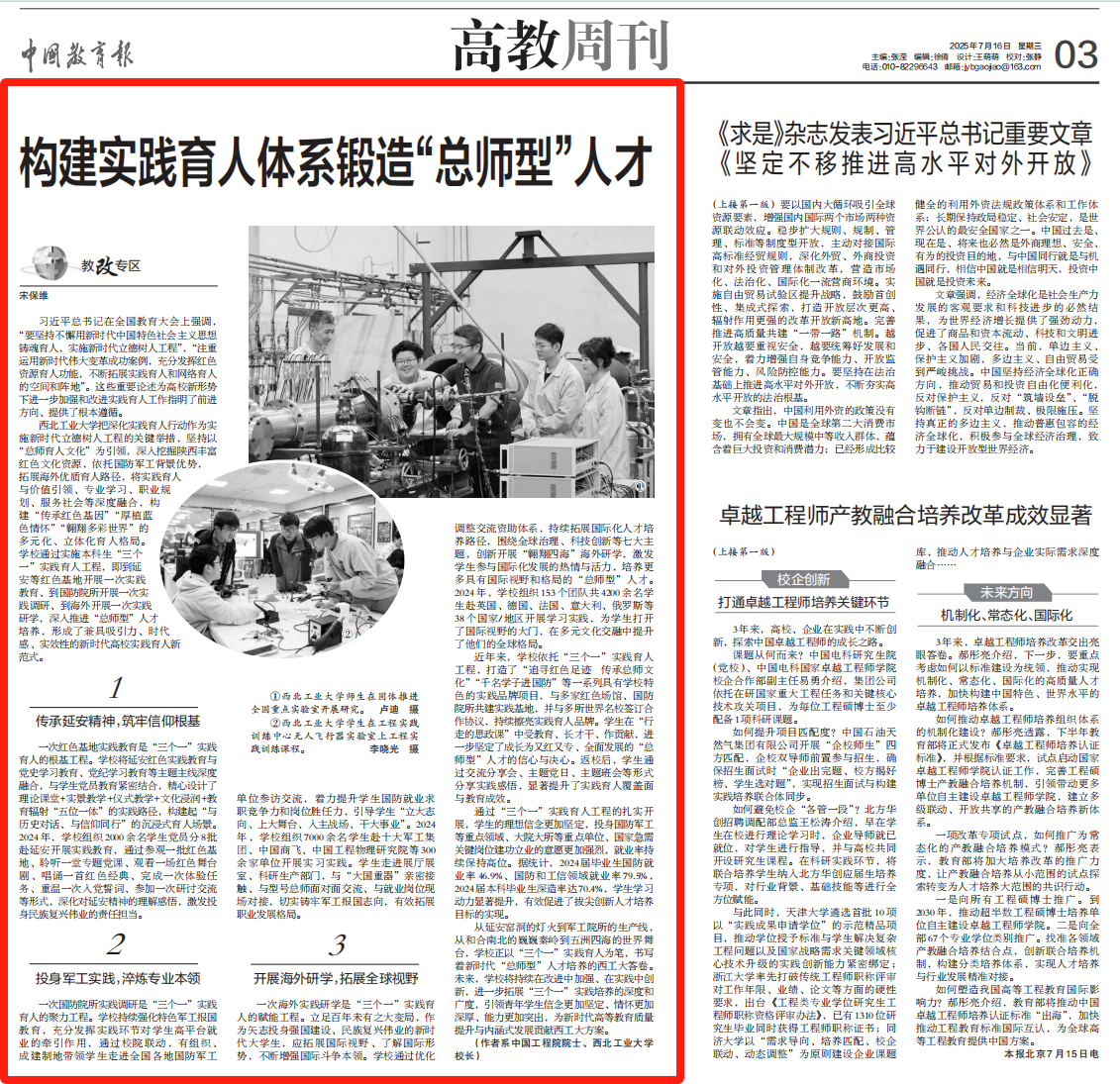 7月16日,《中国教育报》刊发我校校长宋保维署名文章《构建实践育人体系锻造“总师型”人才》。文章阐述了我校“三个一”实践育人工程的特色做法和显著成效。全文如下。
