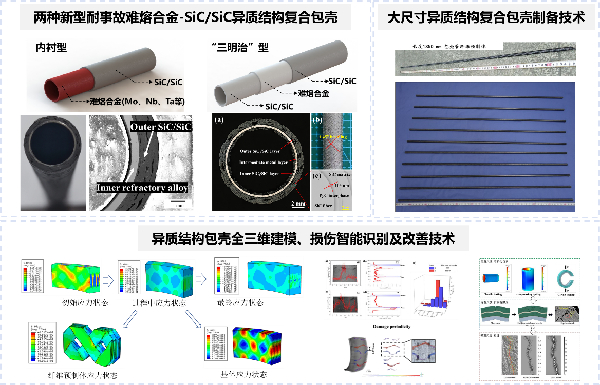 项目介绍:该成果针对国产耐事故SiC/SiC复合包壳气密性、导热性不佳、封装/连接困难及难以损伤监测等关键技术难题,建立了包含两种构型、多种难熔合金材料体系的异质结构复合包壳体系,突破了具有高气密性、高导热及高可靠性等优势的大尺寸先进难熔合金-SiC/SiC异质结构包壳设计及制造技术,建立了异质包壳多物理场耦合失效评价技术,发展了异质结构包壳全三维建模、损伤智能识别及改善技术,实现对材料微观-介观-宏观多尺度全方位损伤失效检测及服役行为预测。相关研究成果已在核动力院、国家电投集团和中核北方核燃料元件有限公司等用户单位开展工程化应用考核验证,为未来新质堆用高温多用途燃料元件研发提供关键技术支撑。