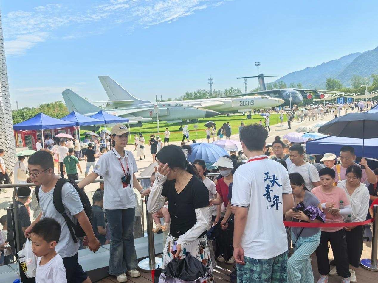 在校园开放期间,军工素质教育实践中心以“硬核展品+厚重历史”构建沉浸式国防教育场景,让公众直观感受祖国国防实力与其中的西工大贡献。室外展场上,运-20物理样机、轰-6、歼轰-7、歼-8、东风2导弹等大国重器整齐列阵,成为最受瞩目的“明星展品”。不少家长带着孩子顶着40℃高温排队参观,只为近距离感受“隐姓埋名,为国铸剑”的军工精神。