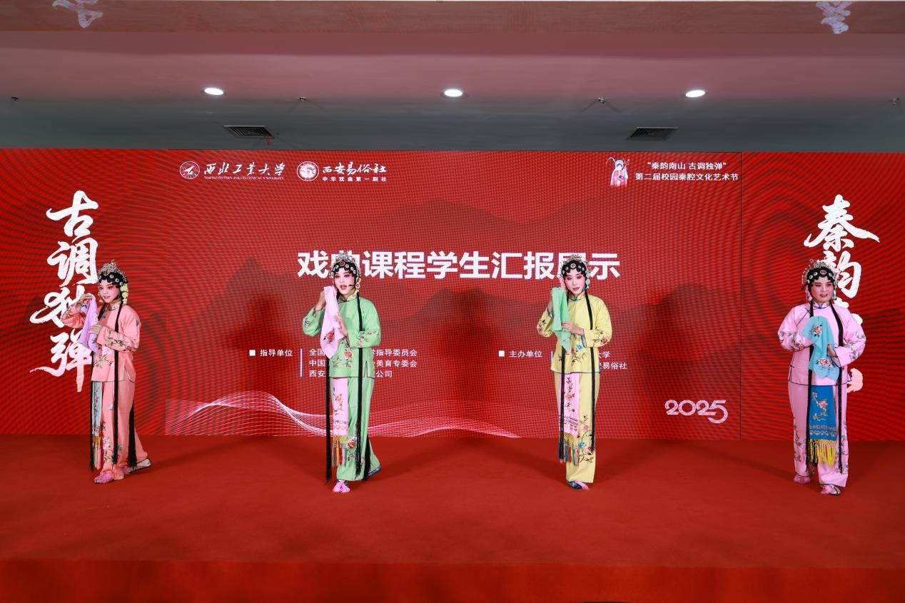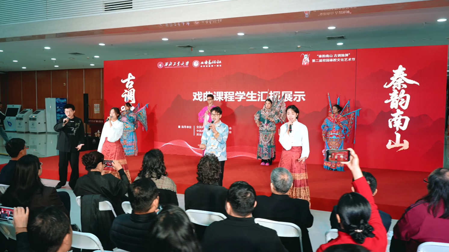 开幕式上,我校秦腔美育课程“秦腔舞台呈现”“秦腔艺术鉴赏”课程学生进行汇报展示,稚嫩、真挚的唱腔再现了“青春与传统对话”的生动图景。西安易俗社艺术家随后进行表演,让秦腔在校园演绎,为师生带来一场兼具艺术美感与文化温度的浸润表演。