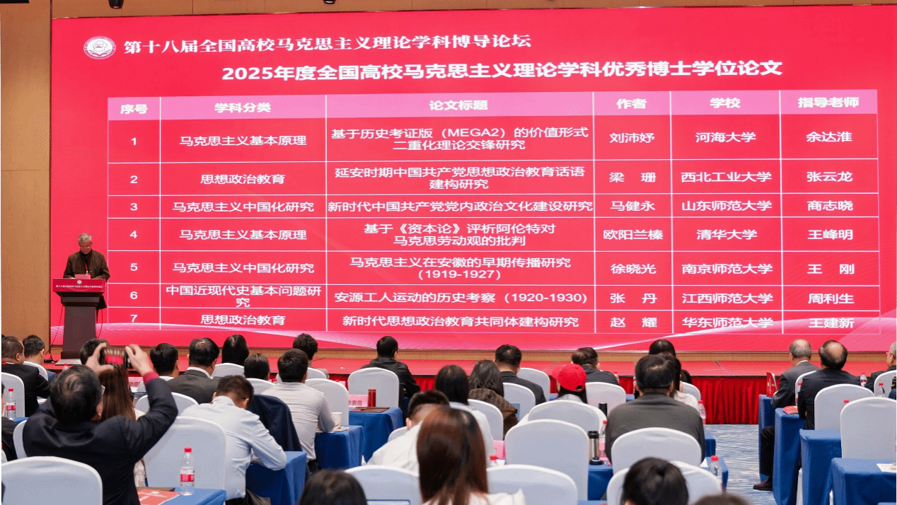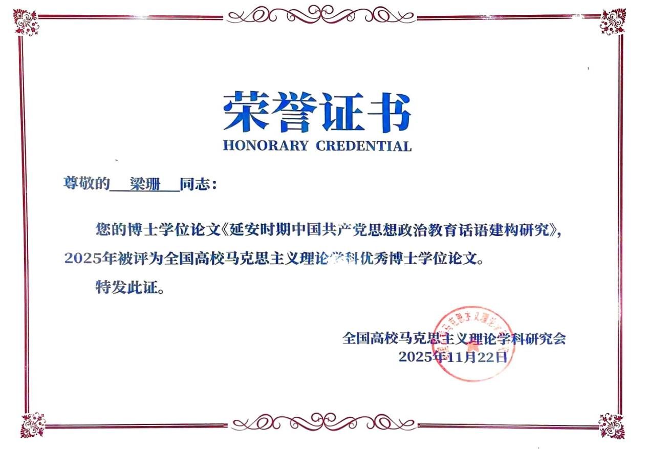2025年11月22日,第十八届全国高校马克思主义理论学科博导论坛在海口举行,会议期间同步举行了2025年度全国高校马克思主义理论学科优秀博士学位论文颁奖仪式。我校马克思主义学院博士生梁珊的博士学位论文《延安时期中国共产党思想政治教育话语建构研究》成功荣获该奖项,其指导教师为张云龙教授。