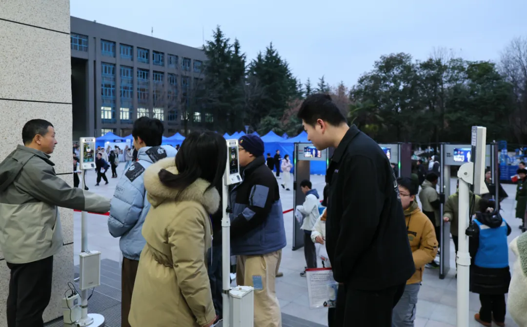 随后,考生在考务和安保人员的引导下,排队通过智能安检与人脸核验,并经考场门口二次安检、核验进入相应考场。