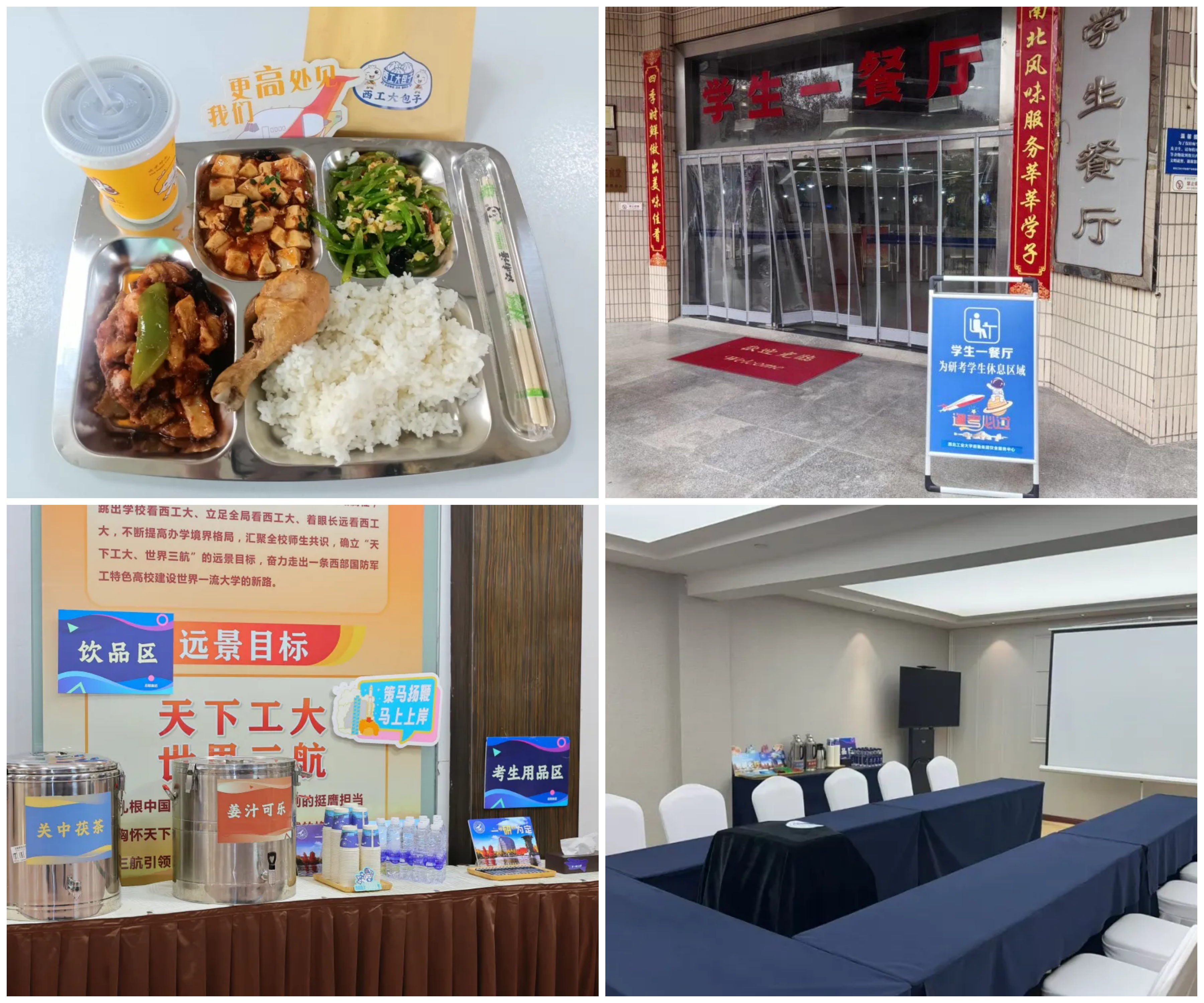 为了保障考生中午就餐,学校在友谊校区学生一餐厅、长安校区云天苑餐厅一楼、星天苑南餐厅二楼设置“研考学生特供窗口”。提供研考专供套餐,有卤鸡腿、木须肉、麻婆豆腐、鱼香茄子等,一份香喷喷的研考专属套餐让考生们吃饱吃好。学校还在考场内外设有暖心服务区。文具、热水、姜茶、打印机一应俱全。中午休息时间校内宾馆还开放会议室作为考生专用休息区,提供文具及热饮帮助考生恢复状态,从容应考。
