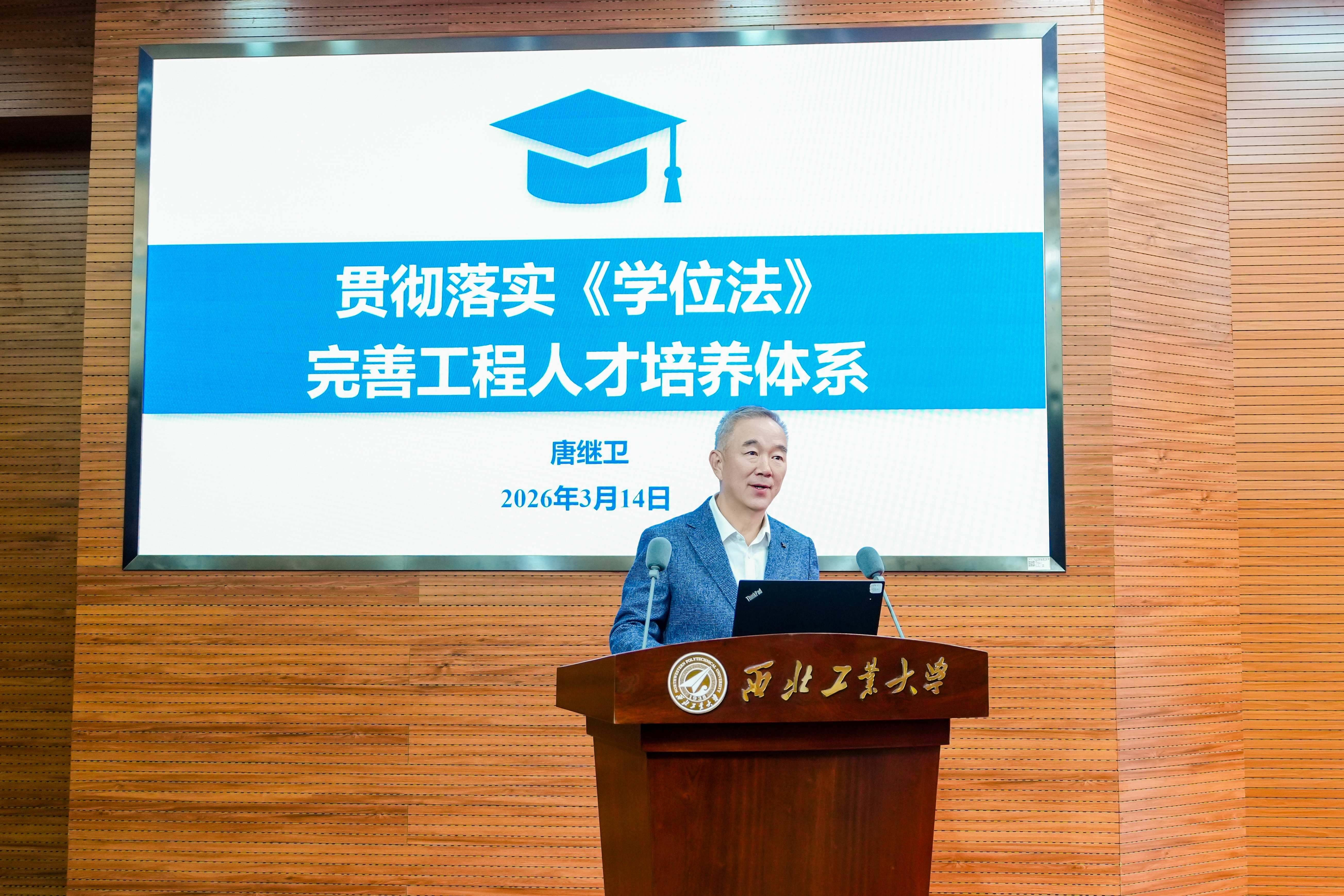 大会报告环节,唐继卫作题为《贯彻落实<学位法> 完善工程人才培养体系》的专题报告,深入解读《学位法》核心要义,明确工程人才培养的方向路径,为推动工程教育高质量发展提供了重要指引。他指出,《学位法》的颁布是新时期党中央推进“教育科技人才”三位一体发展的重大制度建设。要深刻领会颁布实施《学位法》实施的重大意义,持续深化教育领域改革,扩大教育对外开放,加快推进以实践成果申请硕士博士学位工作。要以建设卓越工程师学院为样板,全面推动工程教育高质量发展。