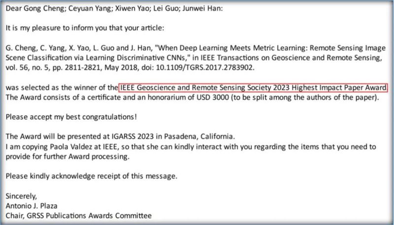 西工大新闻网4月19日电 近期,IEEE地球科学与遥感学会(IEEE GRSS)论文奖励委员会主席Antonio J.Plaza教授发来贺电,祝贺西北工业大学自动化学院脑与人工智能研究团队程塨、韩军伟教授等人合著的论文[1]获得2023年度IEEE地球科学与遥感学会最高影响力论文奖(IEEE GRSS Highest Impact Paper Award)。该奖项由IEEE地球科学与遥感学会设立,是遥感领域最有影响的论文奖项之一。西北工业大学是该论文唯一署名单位。