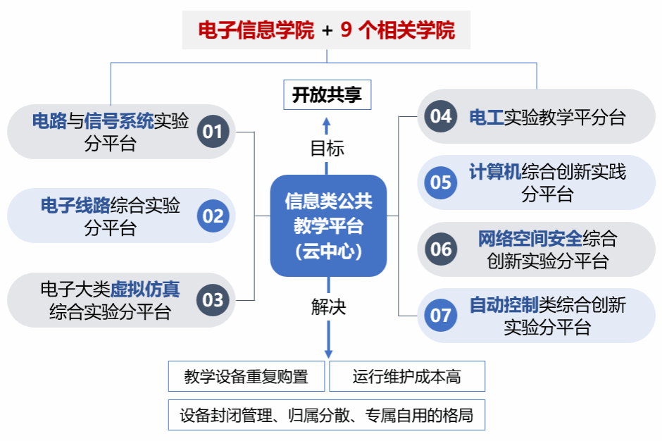 瞄准国家级实验教学中心、虚拟仿真实验教学示范中心的建设目标,建立校级信息类公共教学平台——信息类综合创新实验平台。整合全校信息大类实验室资源,建设7个分平台;盘活现有实验场地和实验仪器,提高利用率和共享率。成立6个公共实验课程群以及6个跨学院信息类实验课程教学团队,根据各专业培养方案,优化教学大纲。以信息类综合创新实验平台为牵引,带动全校人才培养质量提升,培养创新型拔尖人才。