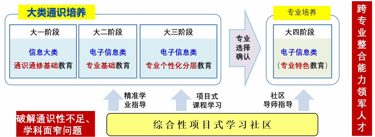 建立“3+1”大类培养模式,贯通大类招生与大类培养。为解决电子信息类人才培养通识能力不足、学科专业知识面窄的问题,满足培养具有跨专业整合能力领军人才的迫切需求,学院构建起“3+1”大类培养模式。大一阶段,按信息大类培养学生,强化通识教育;大二、大三阶段,按电子信息类培养大纲,依托专业基础教育和项目式学习社区,开展专业个性化分层教育,大三结束之际,根据专业准入准出要求和个人需求,进行专业选择与确认;大四阶段,做好本硕衔接课程学习、院所实习实践等专业特色培养。