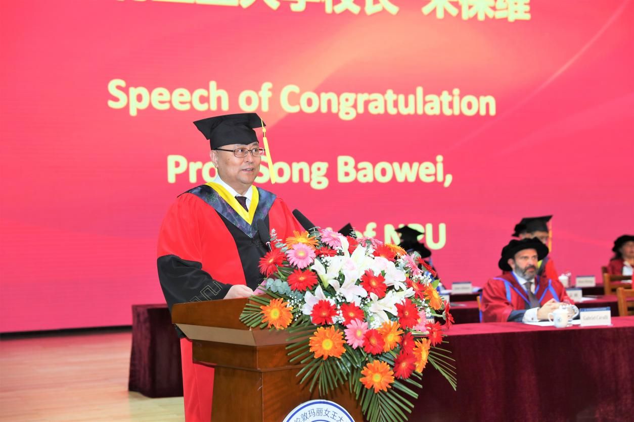 西北工业大学校长宋保维教授向圆满完成本科阶段学习的同学们表示诚挚的祝贺和美好的祝愿。他表示,当下世界百年变局正在加速演进,同学们既是见证者,又是关联者。四年来,大家秉持“公诚勇毅”的校训和“三实一新”的校风,克服了疫情带来的跨境学习压力,见证了中国共产党成立一百周年和党的二十大胜利召开。临别之际,他向同学们提出了四点期望:一是希望同学们坚定信念,敢于担当,不断厚植家国情怀;二是希望同学们勤学苦读,勇毅进取,不断增强学习能动力;三是希望同学们开拓创新,攻坚克难,不断提升创新创造力;四是希望同学们放眼世界,打开格局,持续提升全球胜任力。最后,他衷心祝愿同学们在前进的道路上披荆斩棘,大展宏图,为国家富强和社会进步奉献青春力量!