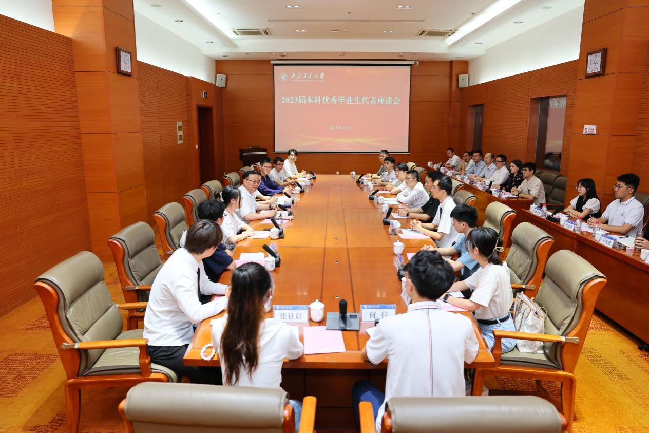 西工大新闻网7月5日电(文字 王翠萍 摄影 卢迪)“情系工大、再启新程”。7月3日下午,我校2023届本科优秀毕业生代表座谈会在长安校区召开。校长宋保维,党委常委、副校长詹浩及相关职能部门负责人,与来自各学院的20位优秀毕业生代表亲切交流。座谈会由詹浩主持。
