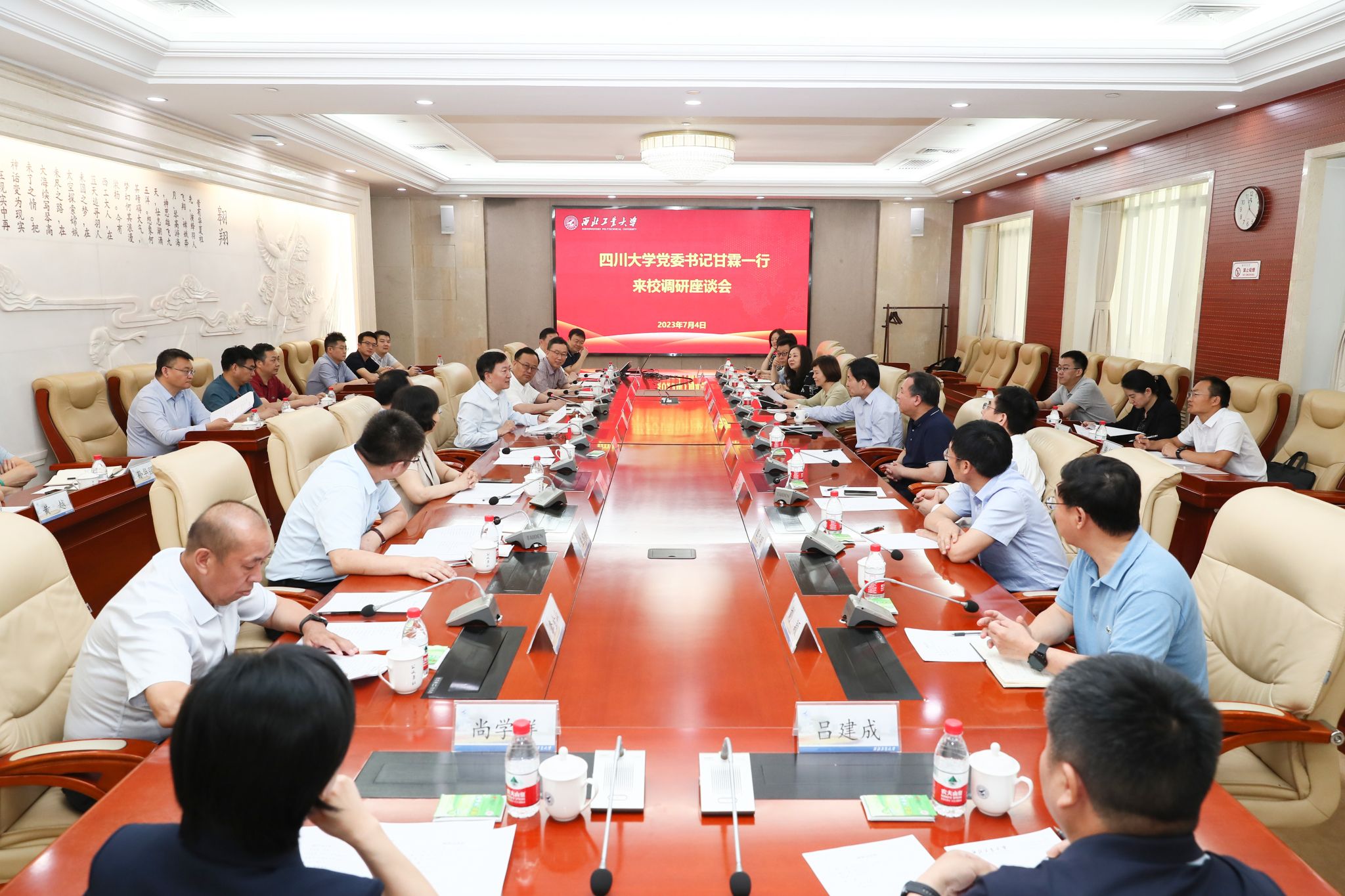 西工大新闻网7月5日电(文字 王翠萍 摄影 周军平)7月4日上午,四川大学党委书记甘霖,常务副校长许唯临、党委常务副书记曹萍一行来校调研。我校党委书记李言荣,校长宋保维分别陪同参观调研,并一同与甘霖一行进行会谈;党委常务副书记程基伟,副校长张卫红、张艳宁,校长助理张开富、王宇波等参加相关活动。座谈会由李言荣主持。