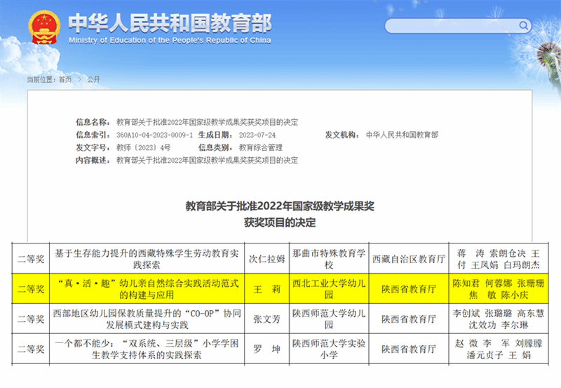 基础教育国家级教学成果奖是我国基础教育教学领域的最高奖项,每4年评审一次,代表了全国教学成果的最高水平。2022年基础教育国家级教学成果奖评审工作,从来自全国各省报送的1797项基础教育成果中遴选出获奖成果570项。西工大幼儿园是陕西省幼儿园中唯一一所连续两届获得国家级教学成果奖的成果单位。