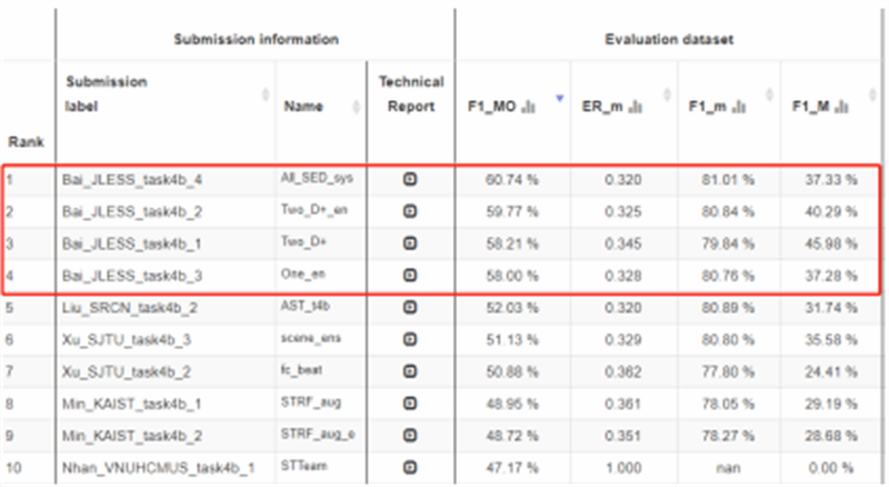 西工大新闻网8月14日电(白吉生 尹涵 白婧熠)近日,第九届国际权威声学场景和事件检测及分类竞赛(Detection and Classification of Acoustic Scenes and Events, DCASE 2023)在其官方网站上公布了比赛结果。西北工业大学航海学院-迅声环境声音感知联合实验室(JLESS)算法团队在竞赛任务4B(基于软标签的声音事件检测)中获得国际第一名的好成绩!这也是我校首次获得该比赛项目第一名。