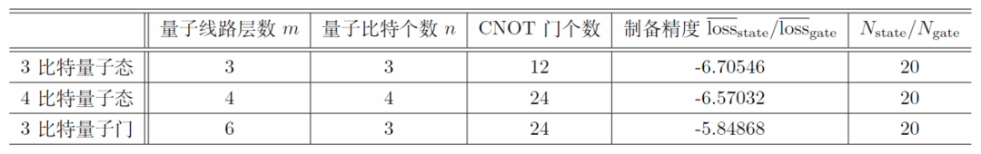 获奖方案制备任意 3、4 比特量子态、任意 3 比特量子门所使用的变分量子线路结构参数、所用CNOT 门个数及可达到的机器精度(欧式距离的对数函数)。