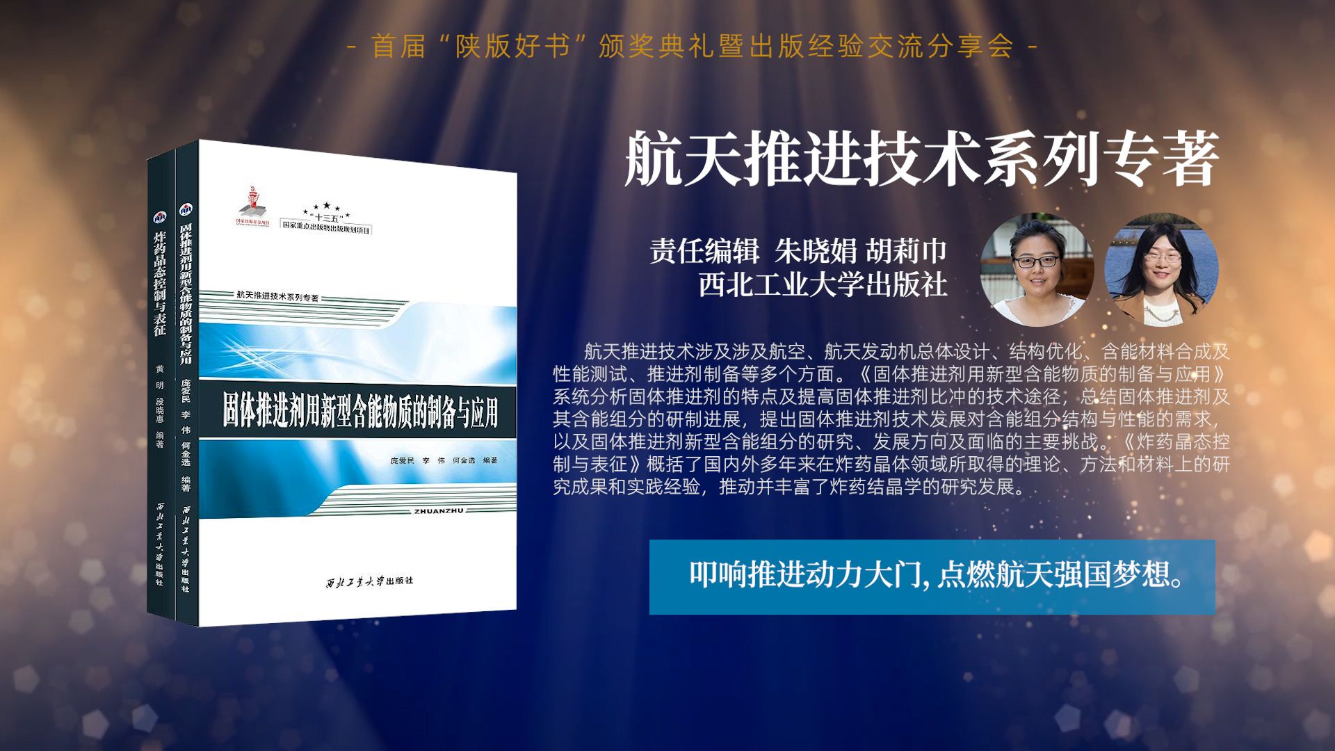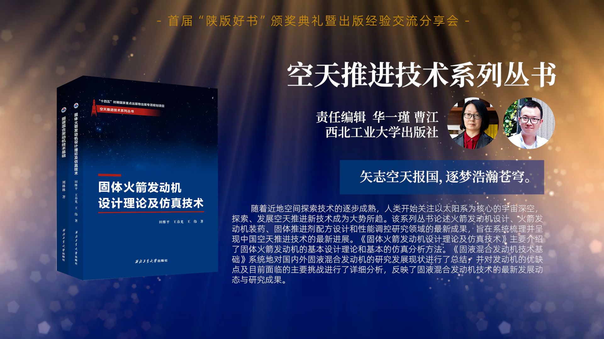 由西北工业大学航天学院、中国航天科技集团有限公司第四研究院、中国工程物理研究院等单位共同编写的《航天推进技术系列专著》和《空天推进技术系列丛书》入选首届“陕版好书”,责任编辑朱晓娟、胡莉巾、华一瑾、曹江获得表彰。