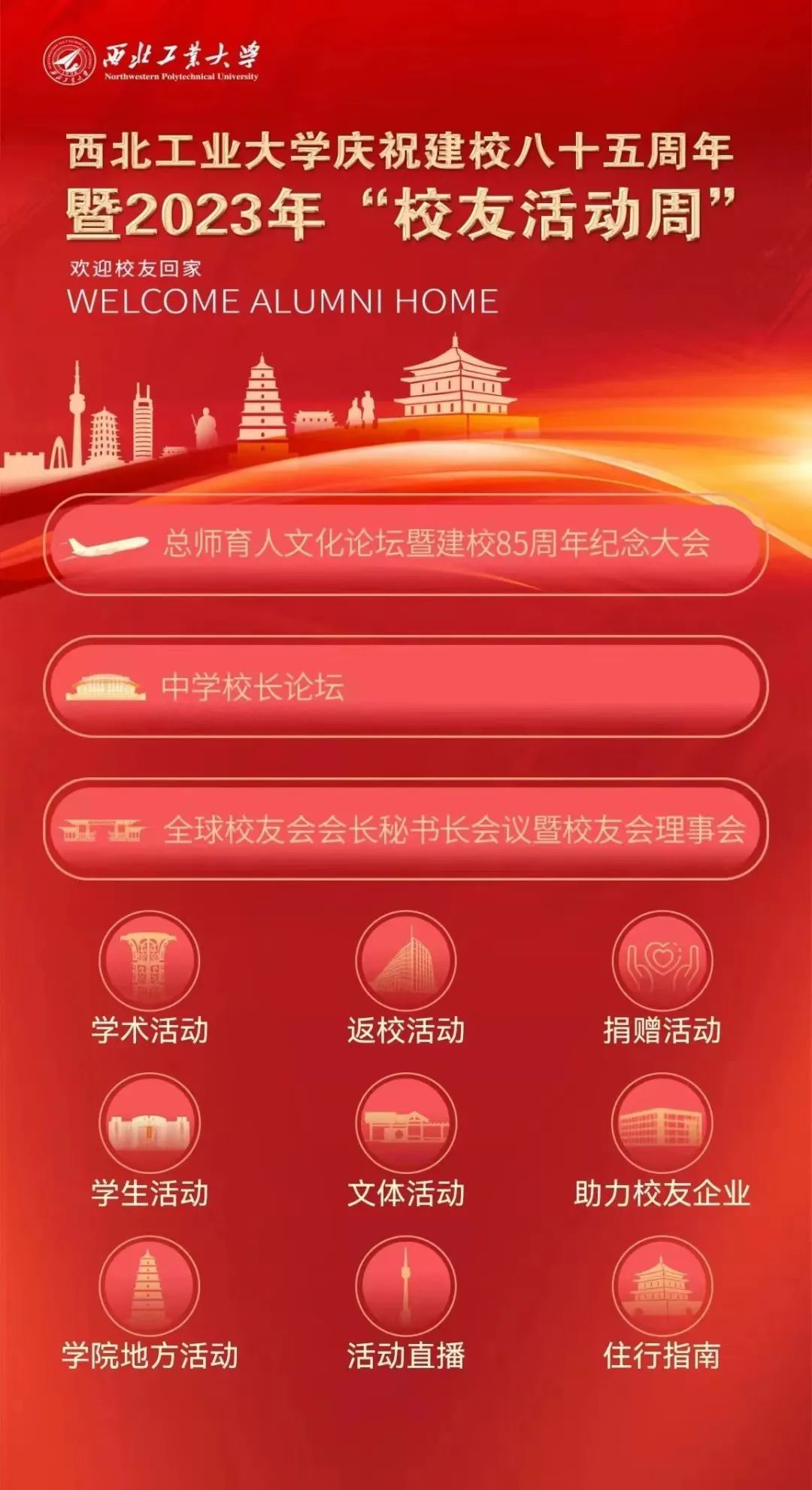 西工大新闻网10月15日电(文字 王庆 郑婧 付怡 摄影 卢迪 司哲 郭友军 王乐宇 张世佳 校友会)10月14-15日,校园里四处洋溢着欢乐喜庆的气氛,西北工业大学庆祝建校85周年暨2023年“校友活动周”系列活动正热烈举行。校长宋保维等校领导,各学院、相关职能部门负责人来到活动现场与2000余位返校校友及其家属共襄盛典,共话情谊,共谋发展。