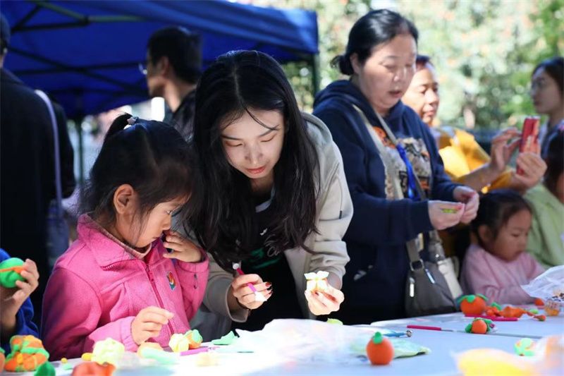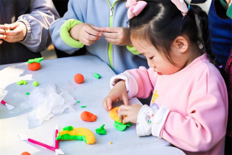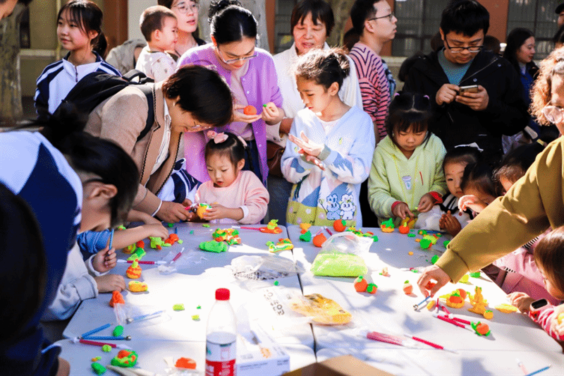 粘土制作区,小朋友和大朋友们围着制作台,正心灵手巧地用粘土“捏”出一个个,精美可爱的柿子,小朋友们玩得不亦乐乎,大朋友们纷纷表示