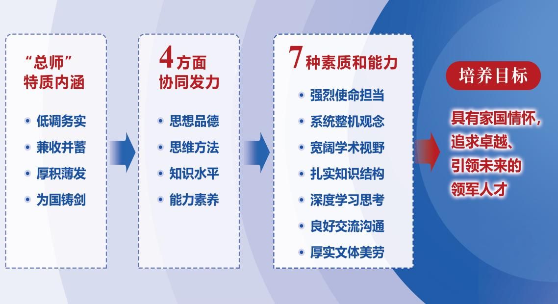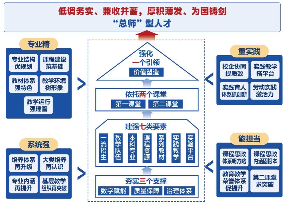 学校通过“总师育人文化”讨论,凝练形成了“低调务实、兼收并蓄,厚积薄发、为国铸剑”的“总师”型人才特质内涵,从思想品德、思维方法、知识水平、能力素养等4个方面协同发力,瞄准“总师”型人才应具备的“强烈使命担当、系统整机观念、宽阔学术视野、扎实知识结构、深度学习思考、良好交流沟通、厚实文体美劳”等7种能力素养,探索形成“强化一个引领、依托两个课堂、建强七类要素、夯实三个支撑”的“总师”型人才培养模式:“强化一个引领”,即强化价值塑造引领;“依托两个课堂”,即依托第一课堂、第二课堂;“建强七类要素”,即建强一流招生、教学队伍、本科专业、课程资源、系列教材、实践教学、实验平台;“夯实三个支撑”,即夯实数字赋能、质量保障、治理体系三个支撑,从“专业精、系统强、重实践、能担当”四个方面发力,培养领军人才。