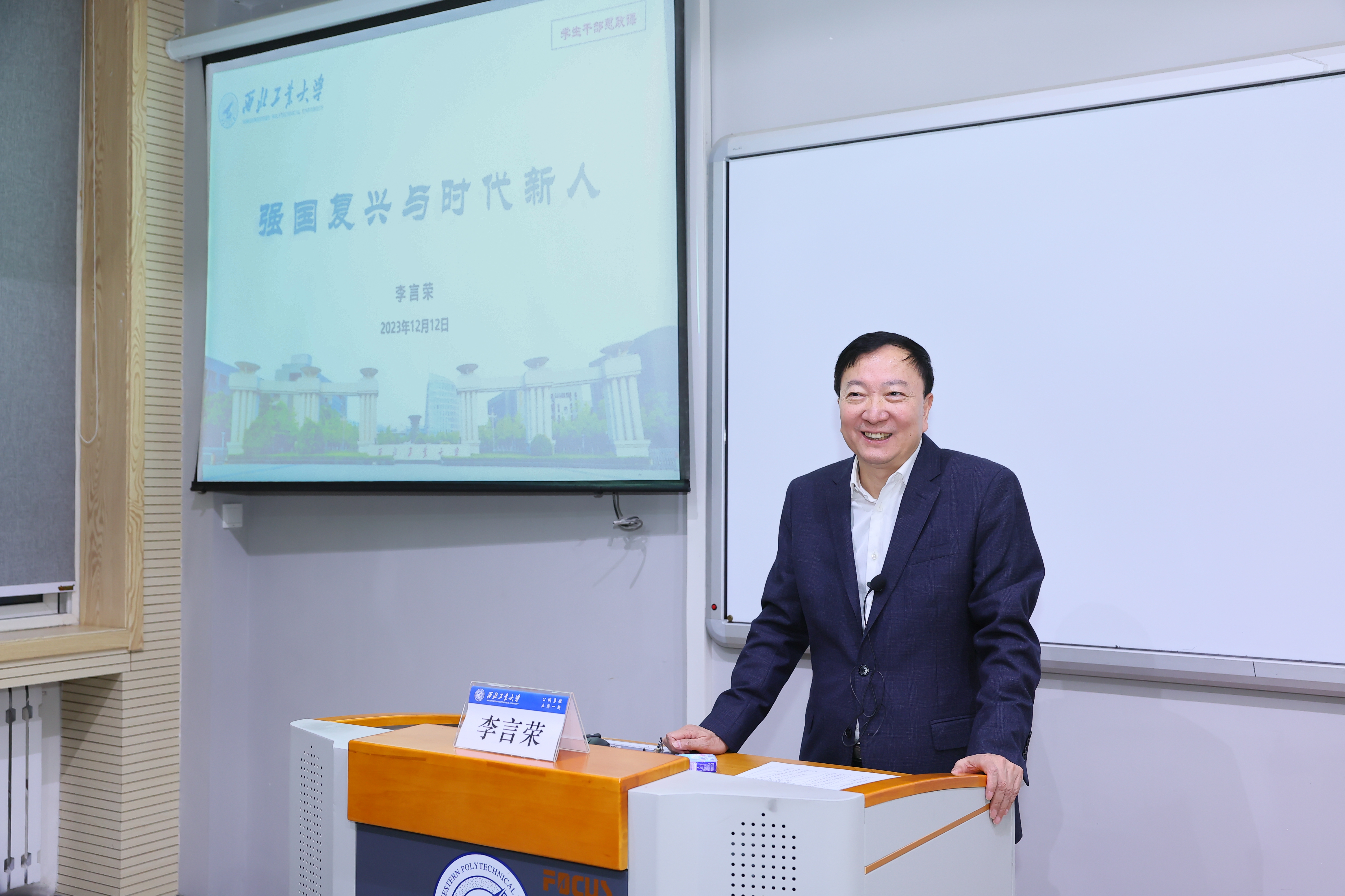 李言荣围绕“强国复兴与时代新人”讲了4个方面的内容:一是与同学们一起就二十大以来习近平总书记对青年学生的系列重要讲话和指示批示精神进行了集中学习,二是怎样理解世界百年未有之大变局,三是为什么当前我国要特别强调高水平科技自立自强,四是西工大青年学生如何做合格的时代新人等方面进行了讲解阐释。