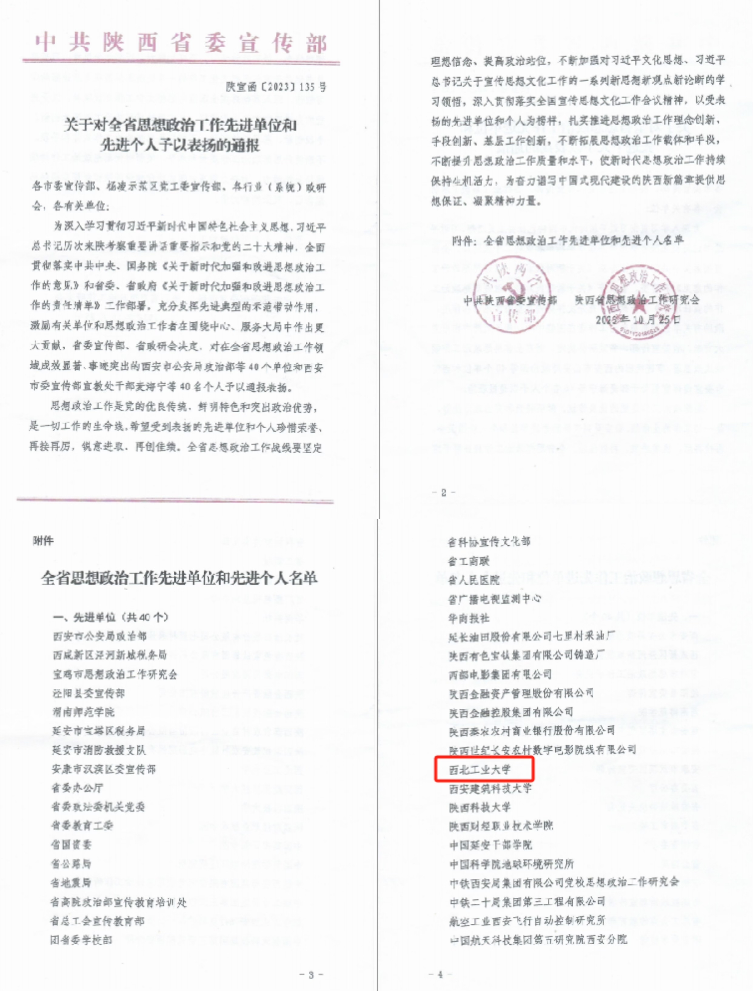 陕西省委宣传部对2023年全省思想政治工作先进单位和先进个人进行了通报表扬。我校获评全省思想政治工作先进单位。
