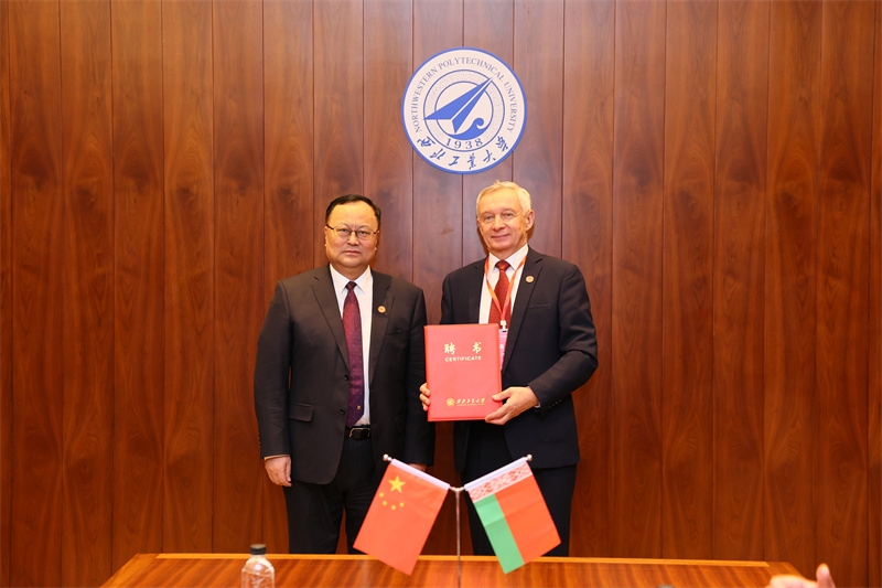宋保维分别为谢尔盖·安东诺维奇·奇日克和谢尔盖·弗拉基米罗维奇·阿布拉梅伊科颁发西北工业大学名誉教授聘书并佩戴校徽。他表示,两位院士是学术界的顶尖人才,在材料以及计算机视觉领域学术成就卓越,他们的加盟将为我校各方面发展带来强有力的支持。西安是古丝绸之路的起点,此次授聘和签约也将是双方合作的起点,期待双方携手努力,为推动中白两国在教育、科技领域的交流与合作,为两国友好关系的发展作出积极贡献。