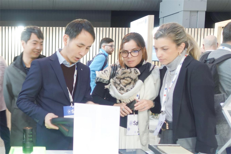 在西北工业大学展台,柔性电子研究院展示了团队最新科技成果,包括低剂量高分辨柔性动态X射线成像技术、鞣制智能方向盘、全透明光伏发电玻璃等,吸引众多全球参会者驻足了解。姚敬大使、马德里自治大学副校长Miguel Manso Silván、Daniel Jaque和Felix Zamora等也亲临西北工业大学展台,详细了解了柔性电子的发展和应用,。