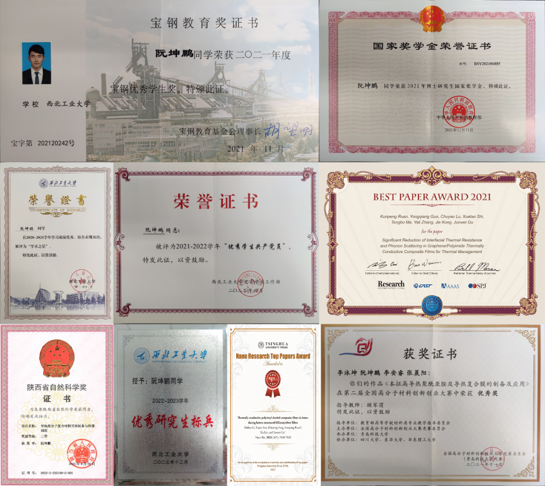 读博期间,阮坤鹏以第一/通讯作者在Angew Chem Inter Ed、Macromolecules和Compos Sci Technol等高水平学术期刊发表SCI论文11篇;参编《Thermally Conductive Polymer Composites》英文专著1部;授权国家发明专利3件。获2022年陕西省自然科学奖二等奖(第五完成人)、陕西省第六届研究生创新成果展评奖理科一等奖、2022~2023学年西北工业大学“优秀研究生标兵”、2021~2022学年西北工业大学“优秀学生共产党员”、2020~2021学年宝钢优秀学生奖学金、西北工业大学“学术之星”等奖励和荣誉。