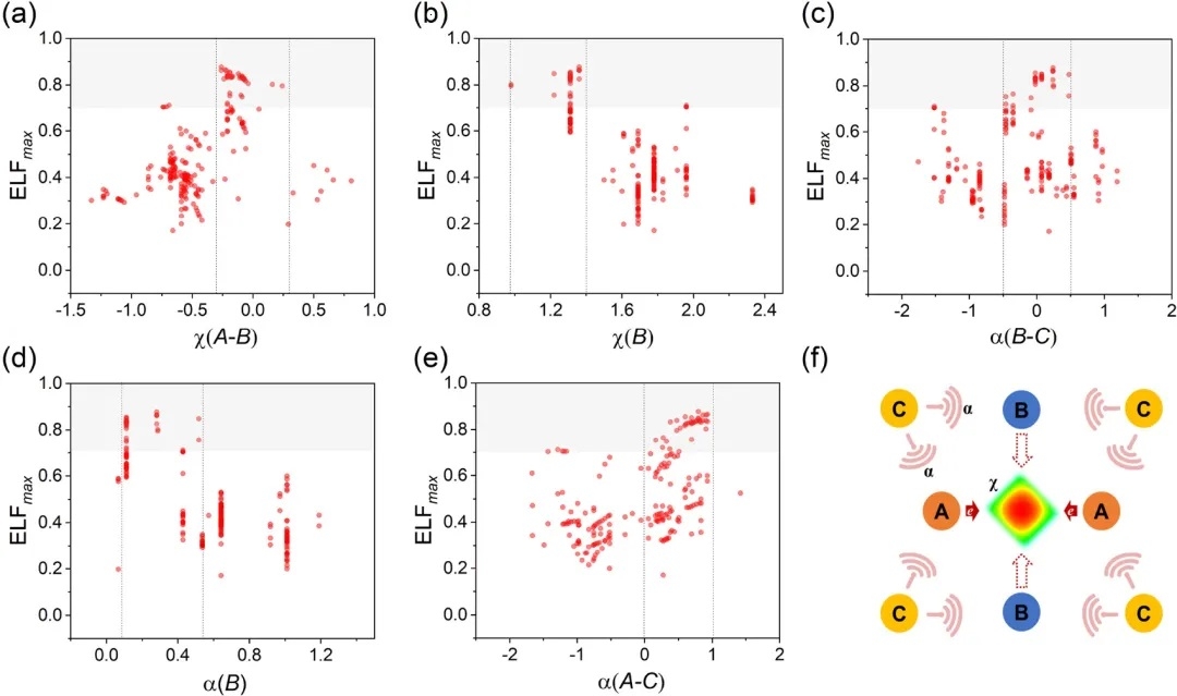 图4. 间隙电子形成分析:(a)χ(A – B);(b)χ(B);(c)α(B – C);(d)α(B);(e)α(A – C);(f)间隙电子形成的示意图