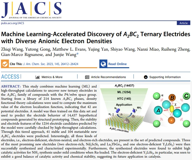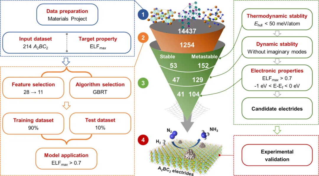 本文首次将机器学习方法引入新型电子化合物的搜索,结合高通量从头算计算筛选,在结构原型为A2BC2(空间群P4/mbm,编号127)的三元化合物中发现电化物。从近14,500种可能的化合物中筛选出145种(44种稳定和115种亚稳定)具有不同阴离子电子密度的A2BC2新型电子化合物。此外,预测结果通过实验得到了验证:两个富电子型(Nd2ScSi2和La2YbGe2)和一个缺电子型(Y2LiSi2)新型电子化合物被成功合成并作为合成氨催化剂进行了研究。
