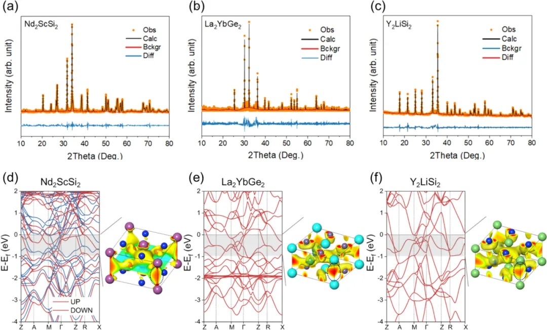 图5. 预测的A2BC2电子化合物的晶体和电子结构。XRD结果:Nd2ScSi2(a)La2YbGe2(b)Y2LiSi2(c)。计算的电子结构:Nd2ScSi2(d)La2YbGe2(e)Y2LiSi2(f)