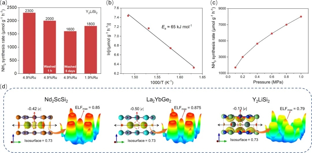图8. 缺电子型电子化合物Y2LiSi2的催化合成氨性能和机理:(a)Ru/Y2LiSi2的催化活性;(b)4.9%Ru/Y2LiSi2的表观活化能测试;(c)不同压力下4.9%Ru/Y2LiSi2的催化活性;(d)Nd2ScSi2,La2YbGe2和Y2LiSi2的Bader电荷和ELF