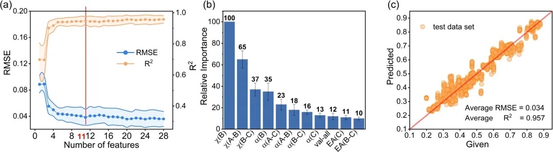 图3. 机器学习模型训练:(a)特征提取过程;(b)特征重要性排序;(c)模型表现效果。