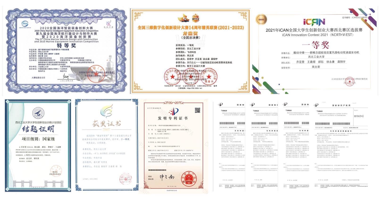 经过一段时间的学习与积累,乔亚斐提出了一种“基于桨扇发动机节能原理的水下推进装置”的创新设想,并在高文君老师的指导下,他与团队成员进一步开展仿真测算,最终研制成功,并获得授权发明专利1项。小试牛刀就初见成效,这让乔亚斐更加坚定了投身中国航空发动机事业的信心和决心。此后,他带领团队成员,先后代表学校、代表西北赛区参加了第九届全国海洋航行器设计与制作大赛等各类创新创业大赛,获得了1项国家级特等奖、1项国家级一等奖等多项成绩。他所在的“酷轮科技团队”也因此荣获学校2020年模范学生团队(共4支)称号。
