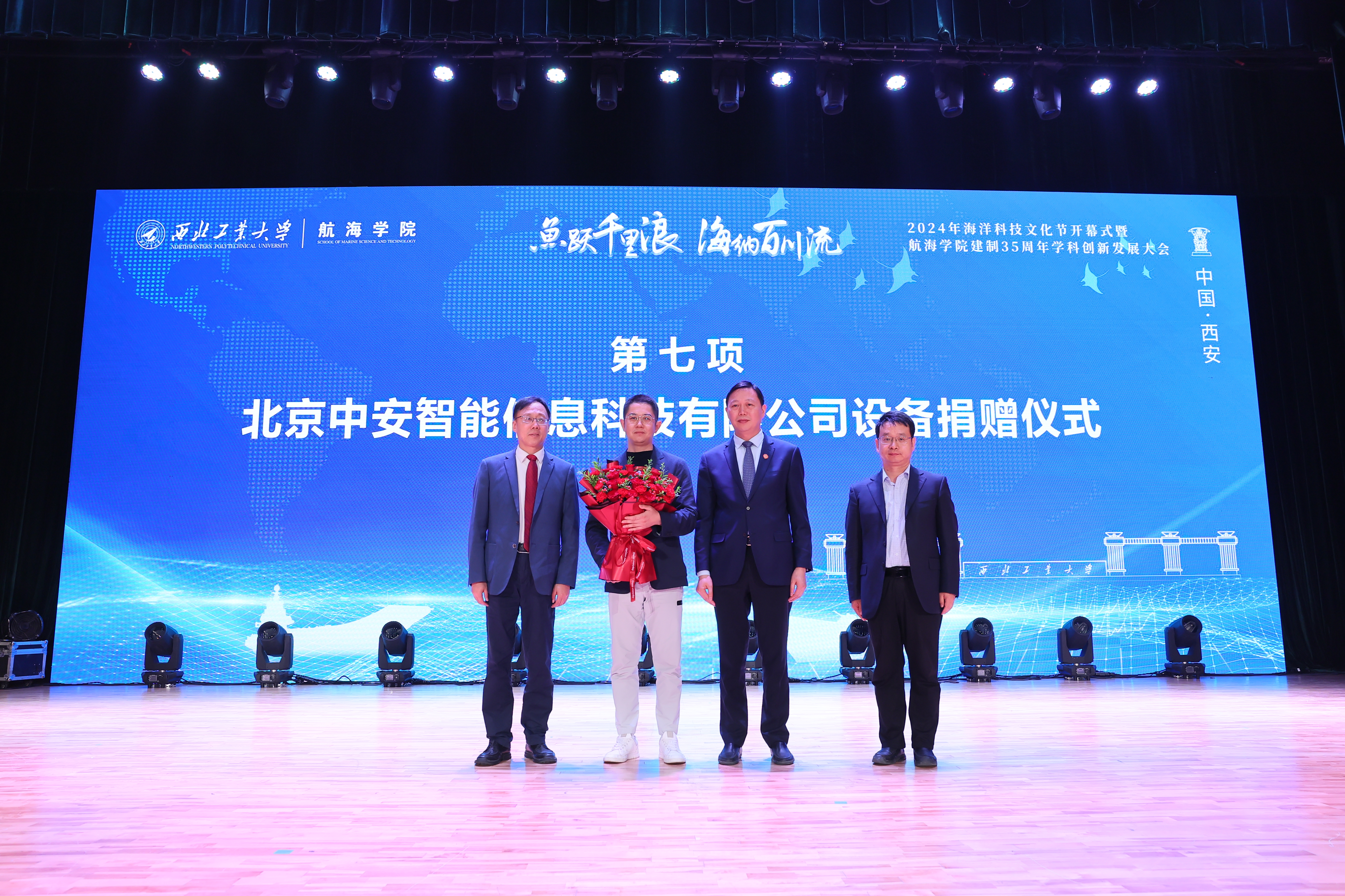 北京中安智能信息科技有限公司总经理陆桦捐赠实验室设备用于支持学院发展。张开富、潘光、杨铭接受捐赠。