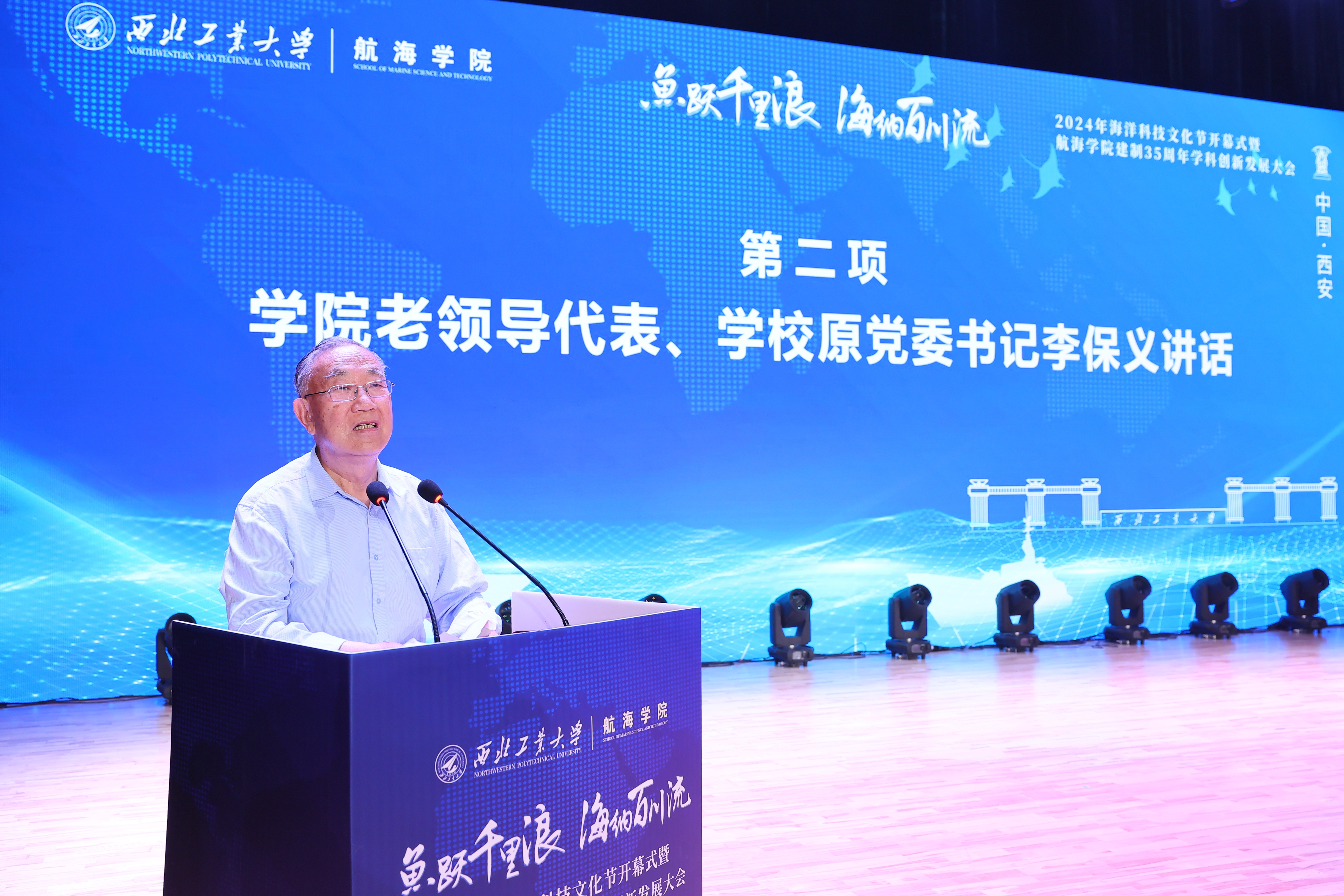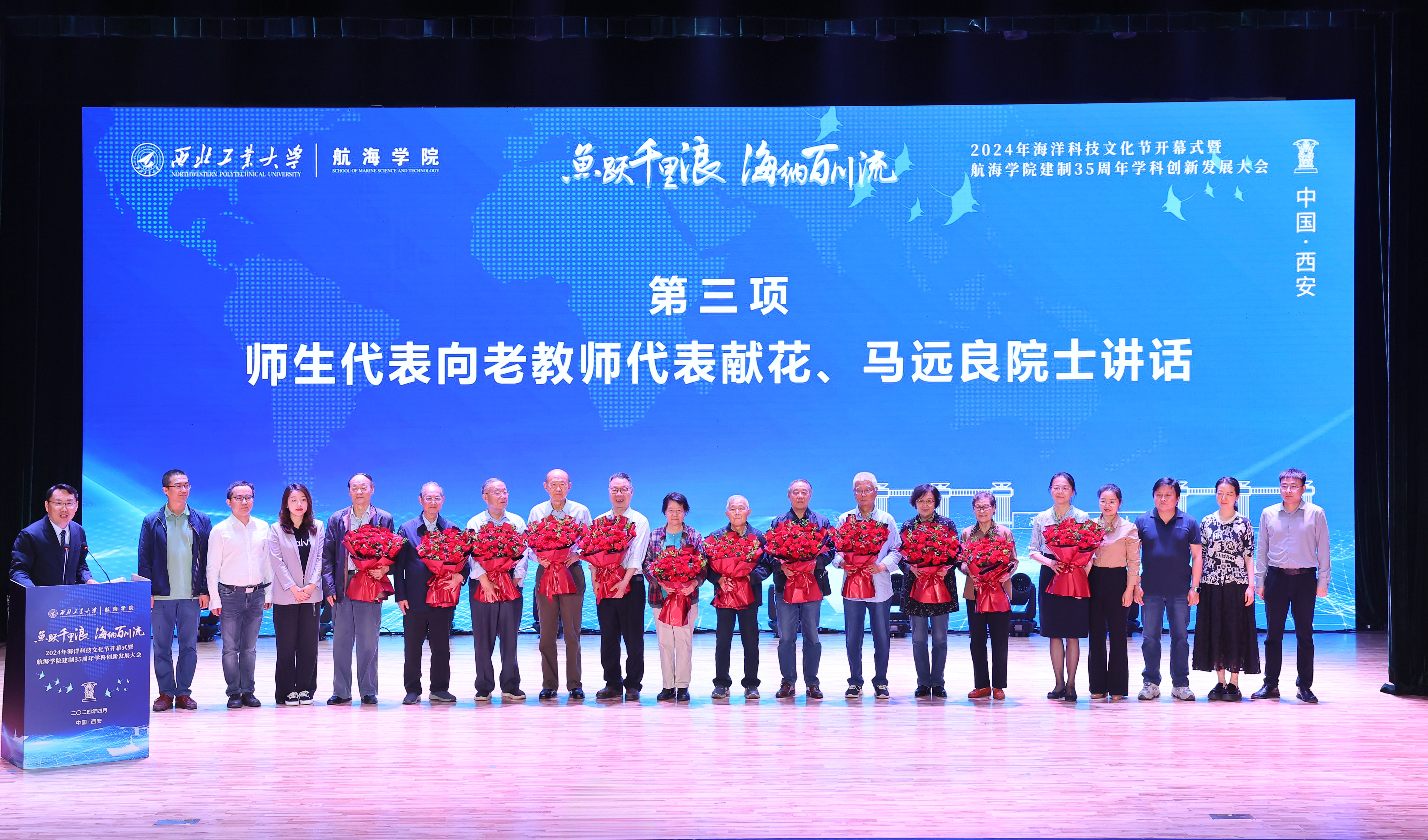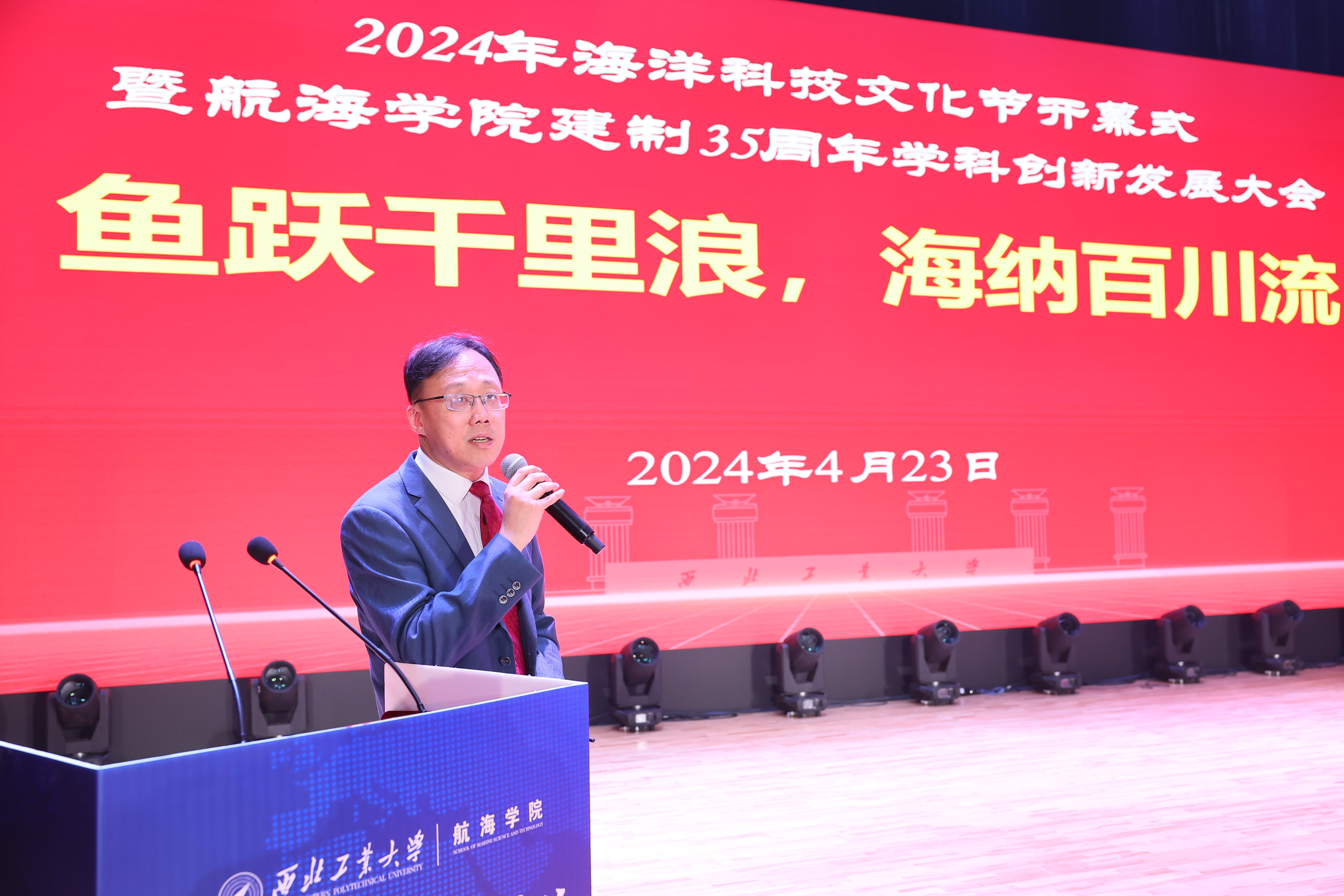 “鱼跃千里浪 海纳百川流”,恰逢我国第75个海军节,4月23日上午,我校2024年海洋科技文化节开幕式暨航海学院建制35周年学科创新发展大会在长安校区隆重举行。中国工程院院士马远良、徐德民,西北工业大学校长、中国工程院院士宋保维,原党委书记李保义,副校长杨益新、张开富,校友代表、中国造船学会副理事长刘郑国,陕西省科技厅一级巡视员赵怀斌,中国船舶第705研究所党委书记孙军亮,山西平阳机械厂董事长聂秋社,中国兵器工业集团第204研究所所长魏卫,西安工程大学校长王海燕等来自国内近百家行业院所、兄弟高校的主要领导、专家学者及学校各职能部门负责人,航海学院历任老领导,老教师代表、校友代表和师生代表等共计300余人参加开幕式。开幕式由航海学院党委书记刘朝亚主持。
