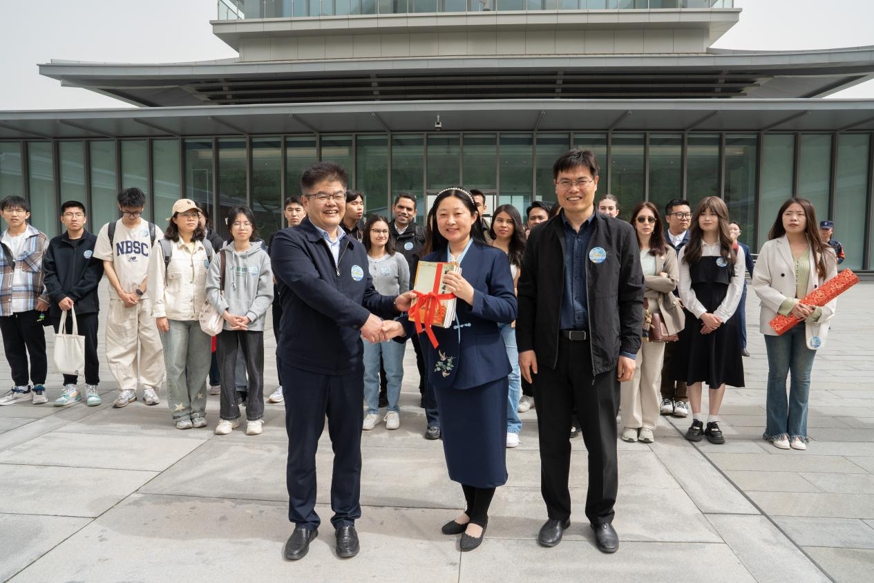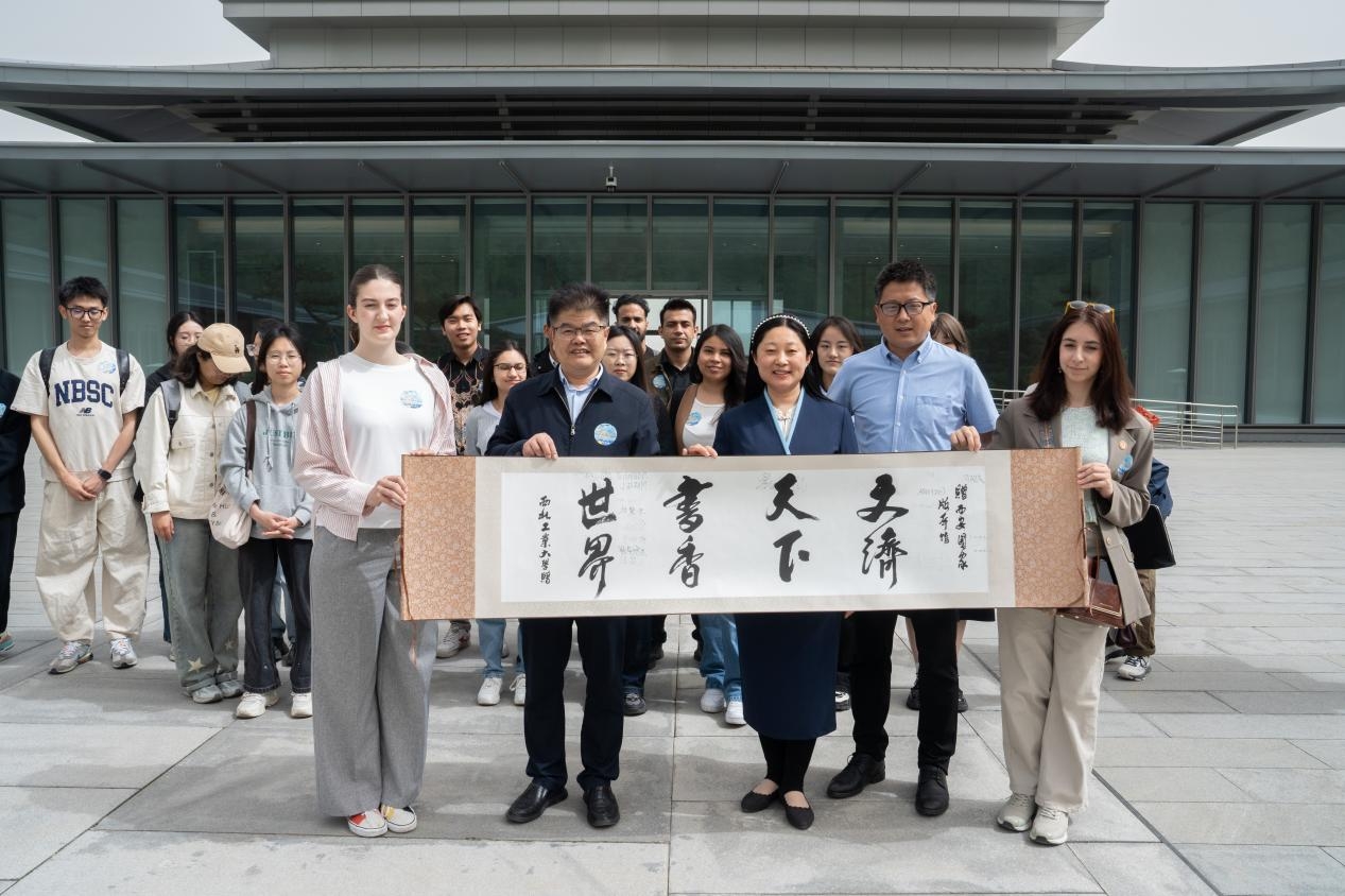 在文济阁前,西北工业大学党委副书记兼党委宣传部部长杨晓对西安国家版本馆的支持表示感谢,并希望后续学校与西安国家版本馆加强深入合作交流,充分发挥文化育人功能。同时对同学们提出殷切希望,希望同学们要爱读书、读好书、善读书,要坚定文化自信,传承弘扬优秀传统文化的时代使命。西北工业大学出版社向西安国家版本馆赠送了丝路主题图书,中外学生向版本馆赠送了“文济天下,书香世界”书法卷轴。中外学生在此开启书香之门,感悟文济天下的智慧与情怀。