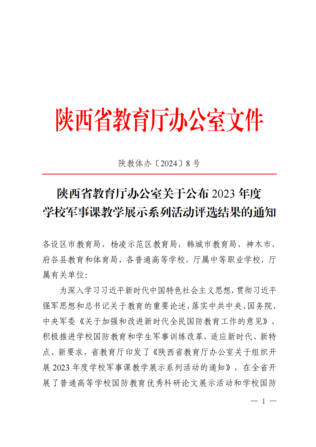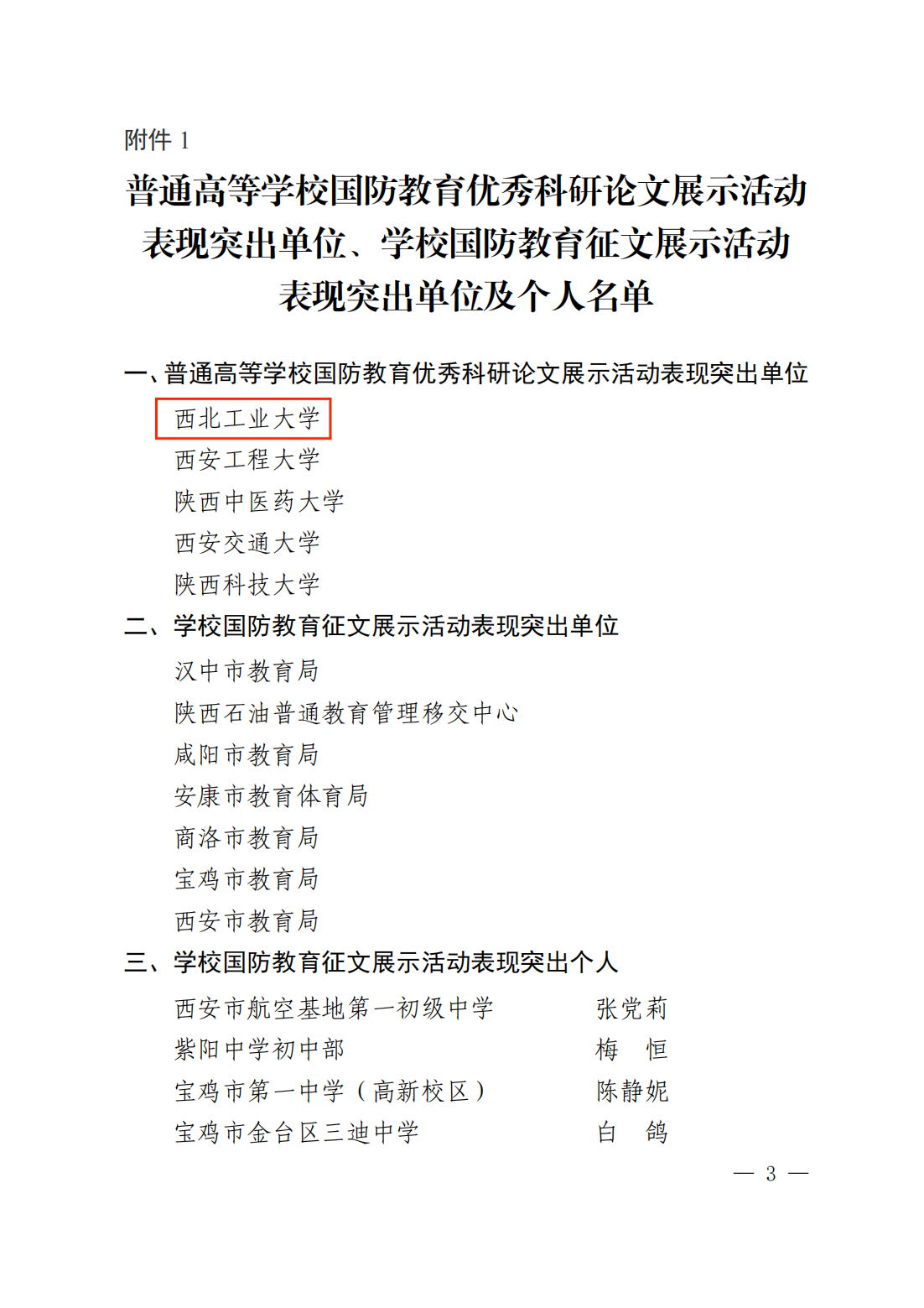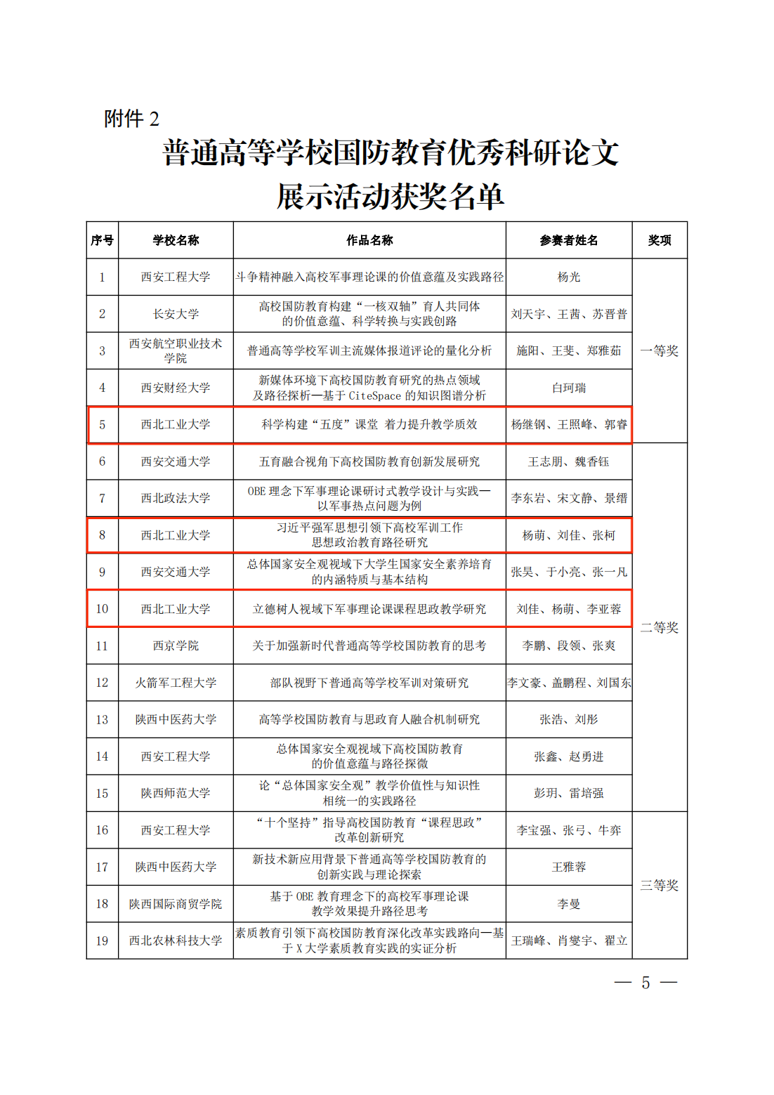 近日,陕西省教育厅印发《关于公布2023年度学校军事课教学展示系列活动评选结果的通知》(陕教体办〔2024〕8号),西北工业大学荣获“普通高等学校国防教育优秀科研论文展示活动表现突出单位”。我校军事理论研究室教师杨继钢、王照峰、郭睿的参赛作品《科学构建“五度”课堂着力提升教学质效》获普通高等学校国防教育优秀科研论文一等奖。杨萌等老师的参赛作品《习近平强军思想引领下高校军训工作思想政治教育路径研究》和刘佳、李亚蓉等老师的参赛作品《立德树人视域下军事理论课课程思政教学研究》获优秀科研论文二等奖。我校获奖数量和质量位列全省高校榜首。