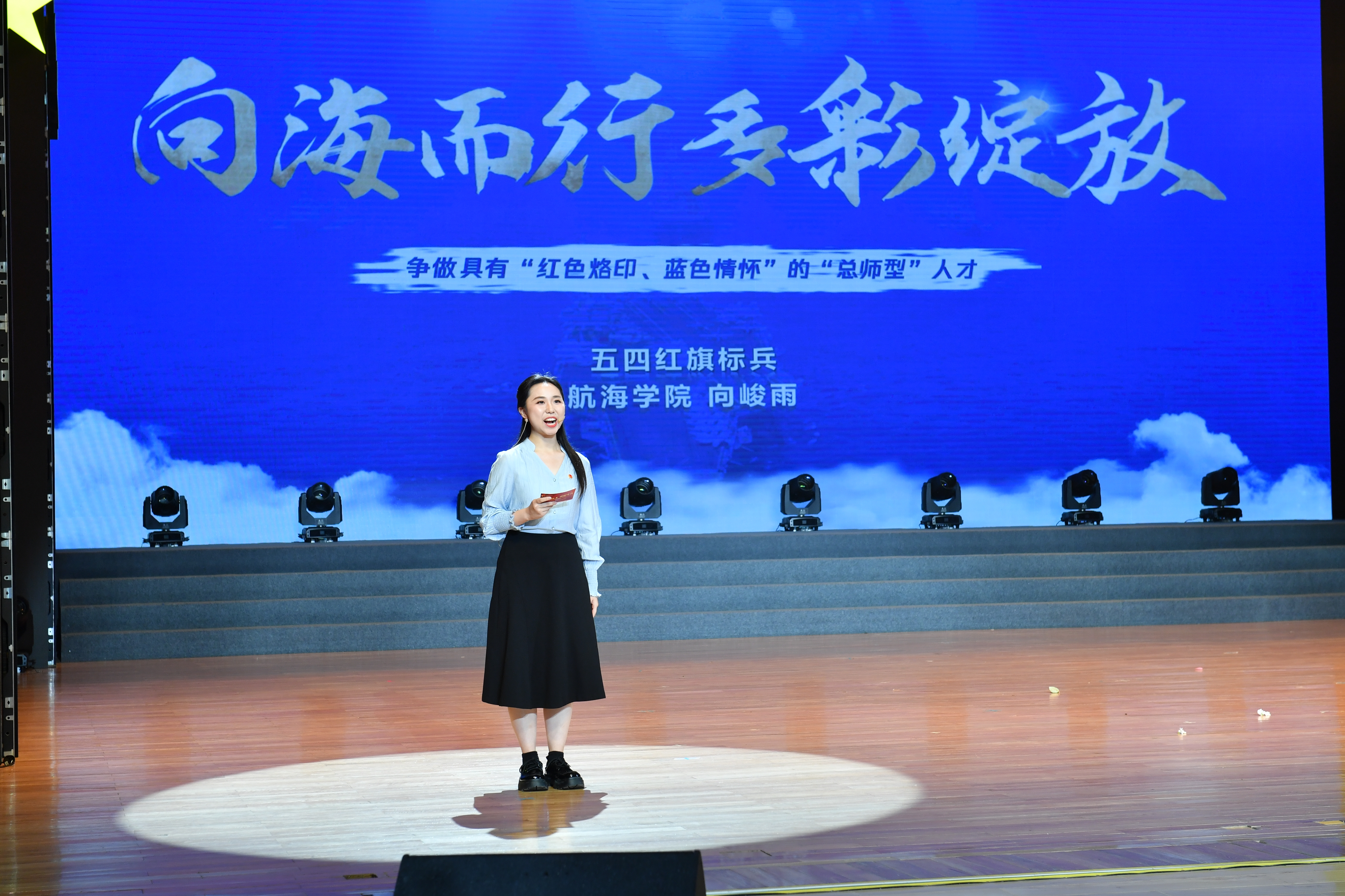 2024年学校五四红旗标兵代表、航海学院2022级博士研究生向峻雨以“向海而行,多彩绽放”为主题,分享在青春赛道上踔厉奋发、步履不停的榜样故事,呼吁我校全体团员青年争做具有“红色烙印、蓝色情怀”的“总师型”人才。