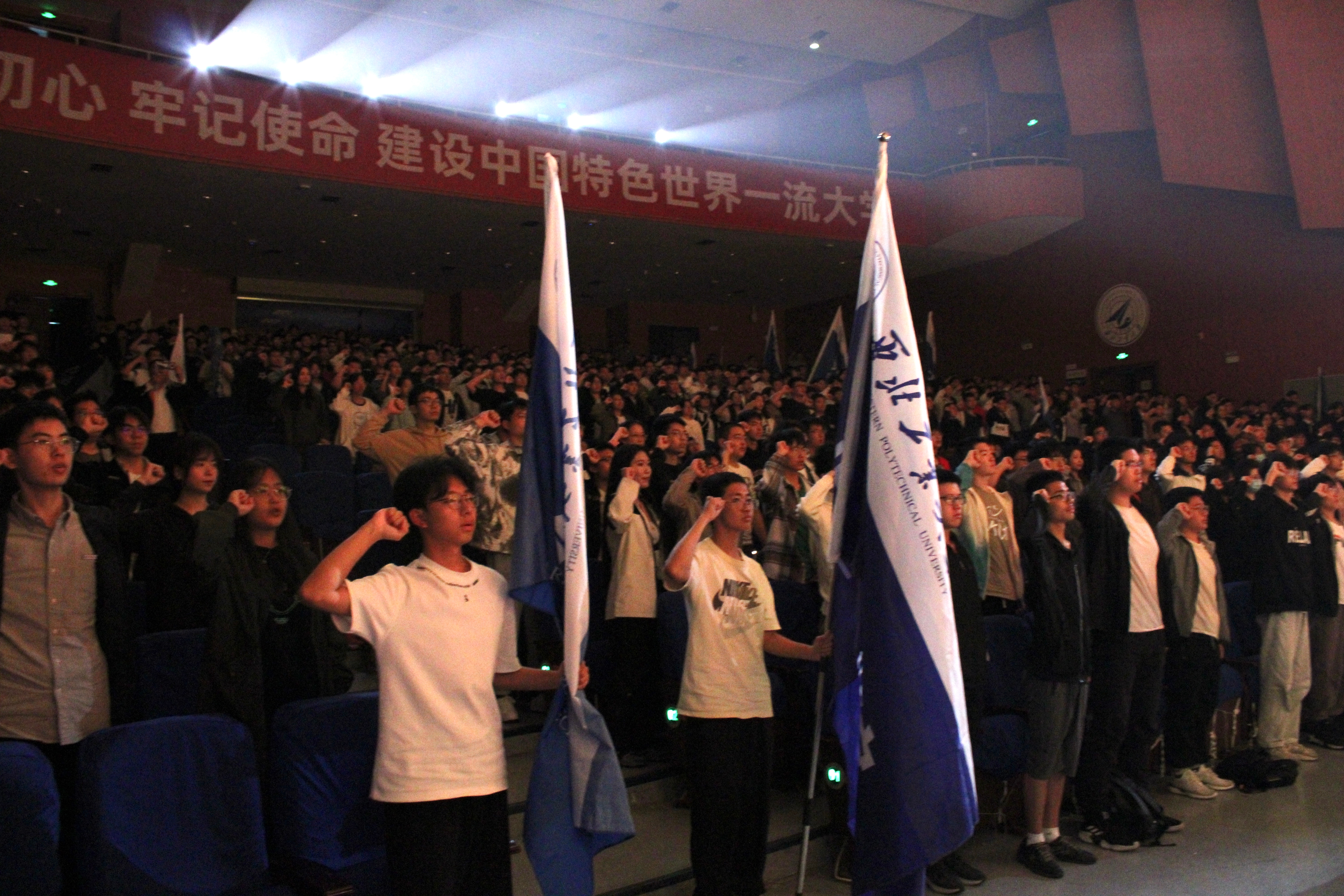 随后全场团员青年举起右拳,庄严宣誓,铮铮誓言,铿锵有力:我是西工大青年,是祖国忠诚的儿女,五四火种在心,先辈夙愿在胸,复兴大任在肩。我们庄严承诺:以青春之我,传承五四薪火;以青春之我,勇担国家之责;以青春之我,绽放时代之光。天下工大,世界三航;为国铸剑,强国有我!为国铸剑,强国有我!为国铸剑,强国有我!