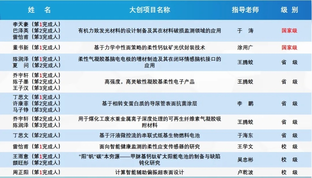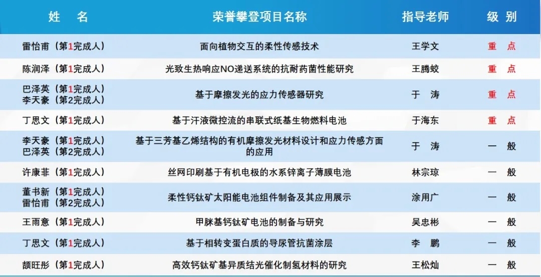 基于柔性电子产业的整体布局,HC002106班以兴趣为导向,在柔性电子学下设的有机电子、印刷电子、生物电子、能源电子四个二级学科中均产出了相关成果,发表学术论文2篇,申请发明专利6项。通过主持、参与科研项目,同学们深刻了解到了科研工作的重要性,立志把论文写在祖国大地上。