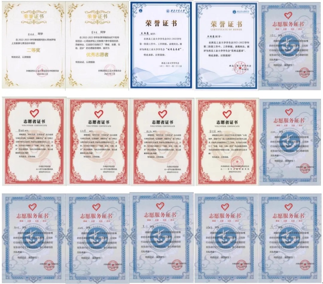 班级同学累计获各类荣誉称号40余人次,同学们参加各类党团活动,收获颇丰、获奖颇多。巴泽英同学参加陕西省高校少数民族大学生延安教育实践活动并获“优秀学员”,入选西北工业大学青马工程第十五期大学生骨干培训班并优秀结业,获学院“喜迎党的二十大,奋进新征程”主题征文活动三等奖;周正阳同学获学院“百年党史学习感悟”活动二等奖等。