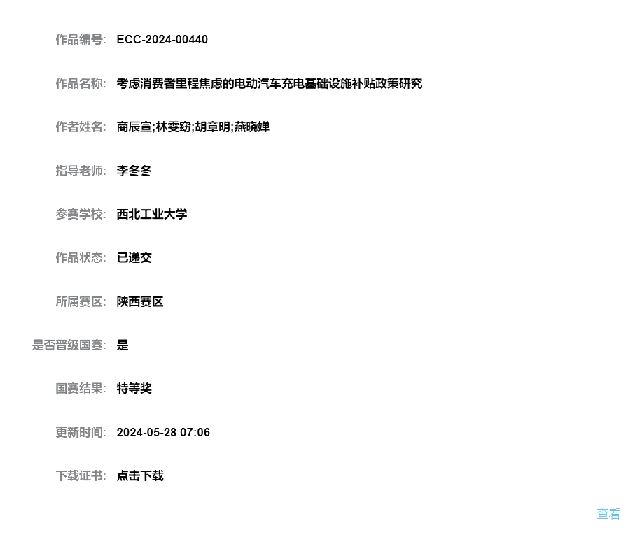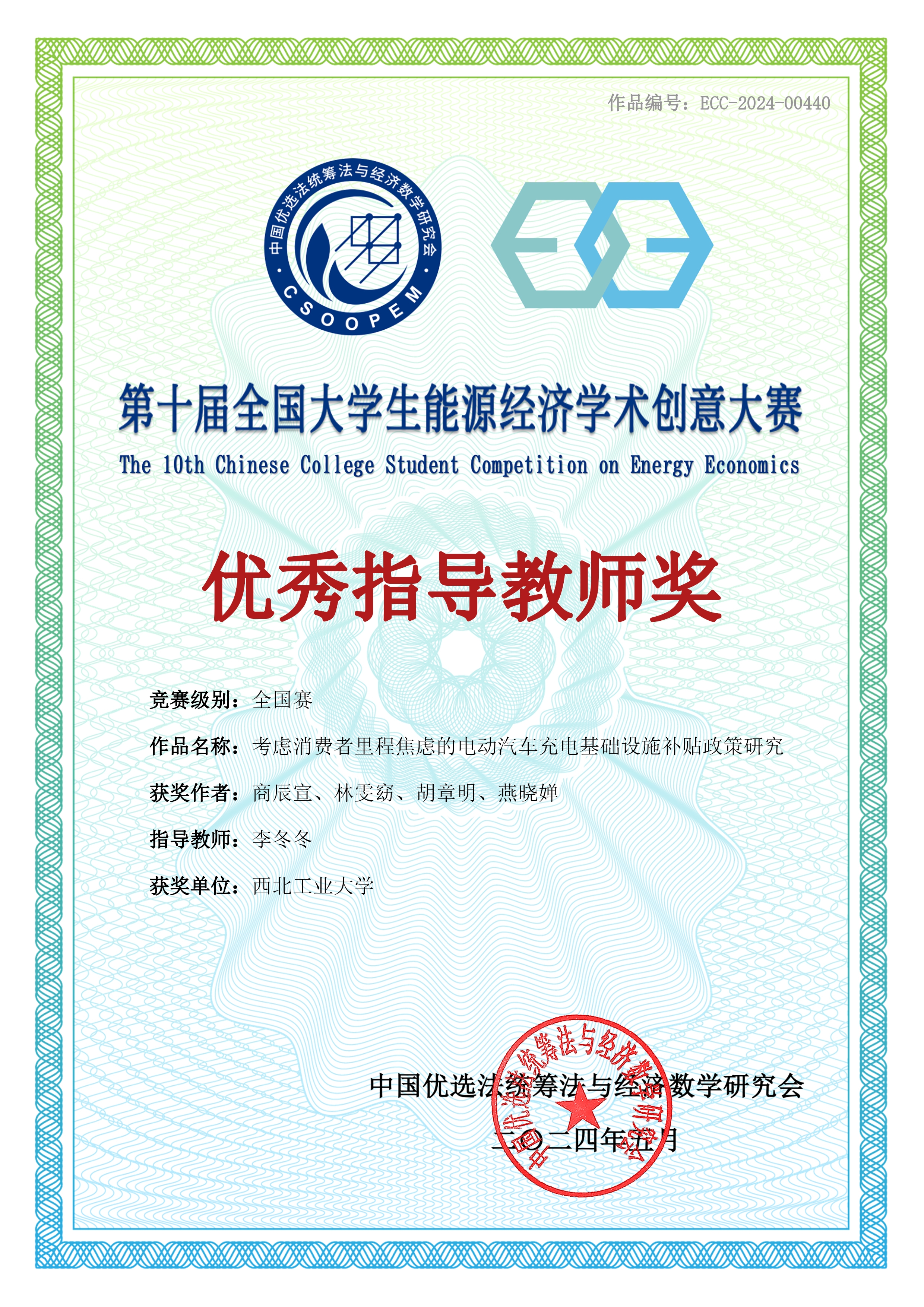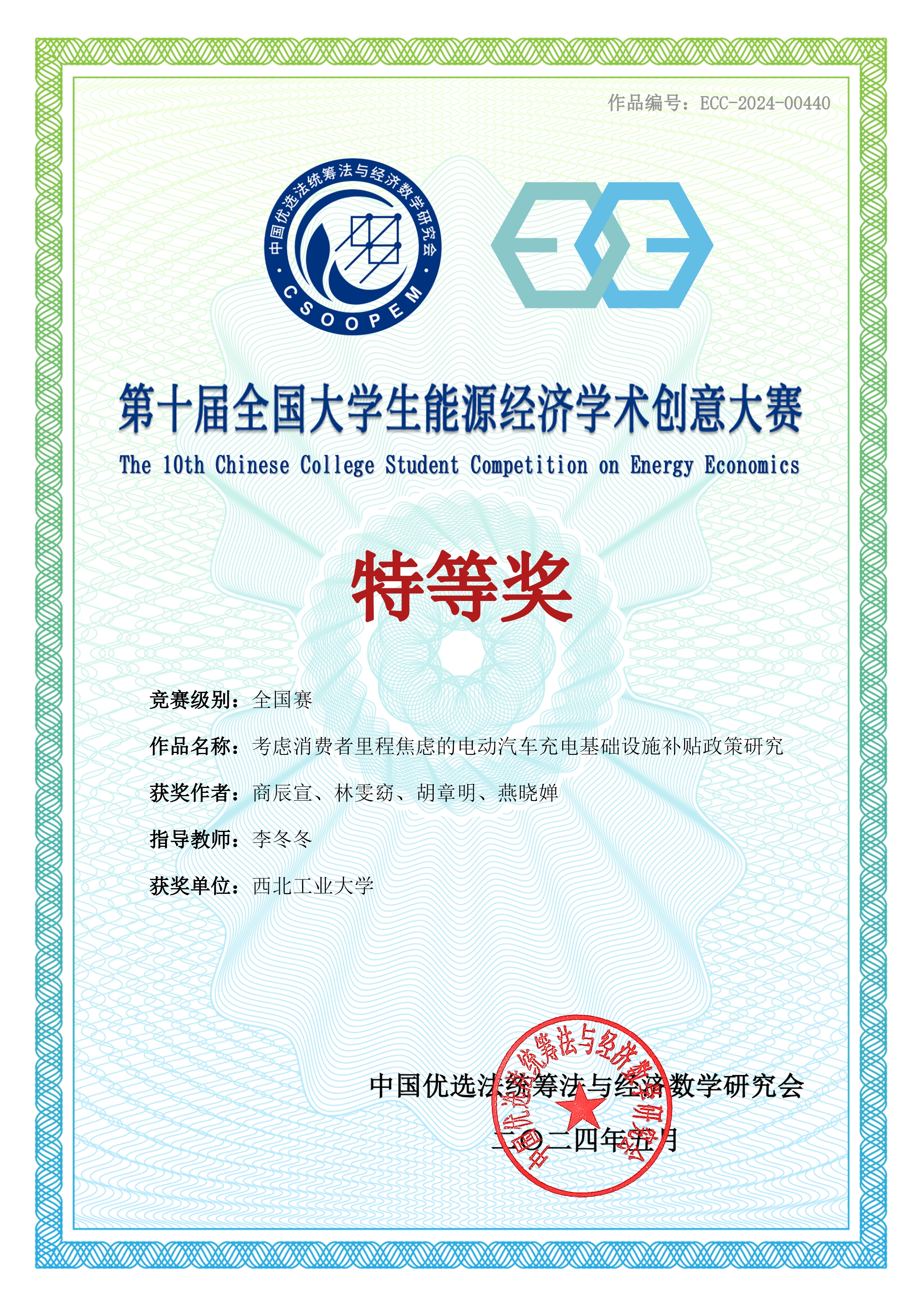 在学校教务部的指导和支持下,公共政策与管理学院的新文科创新实践基地积极组织此次竞赛。基地指导老师李冬冬带队,我校公共政策与管理学院本科生商辰宣、林雯窈、胡章明、燕晓婵组成的参赛团队凭借参赛论文《考虑消费者里程焦虑的电动汽车充电基础设施补贴政策研究》,荣获全国特等奖。