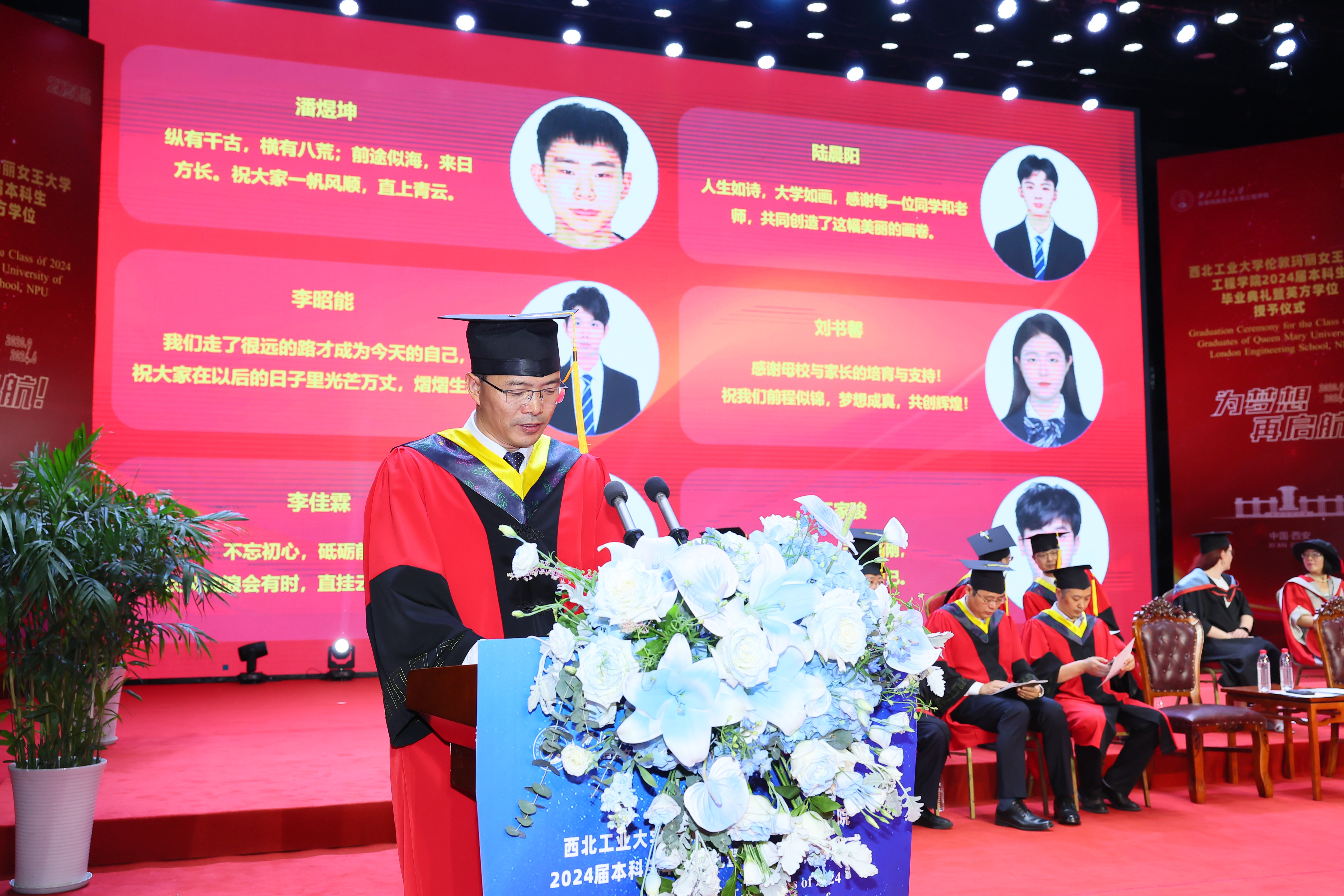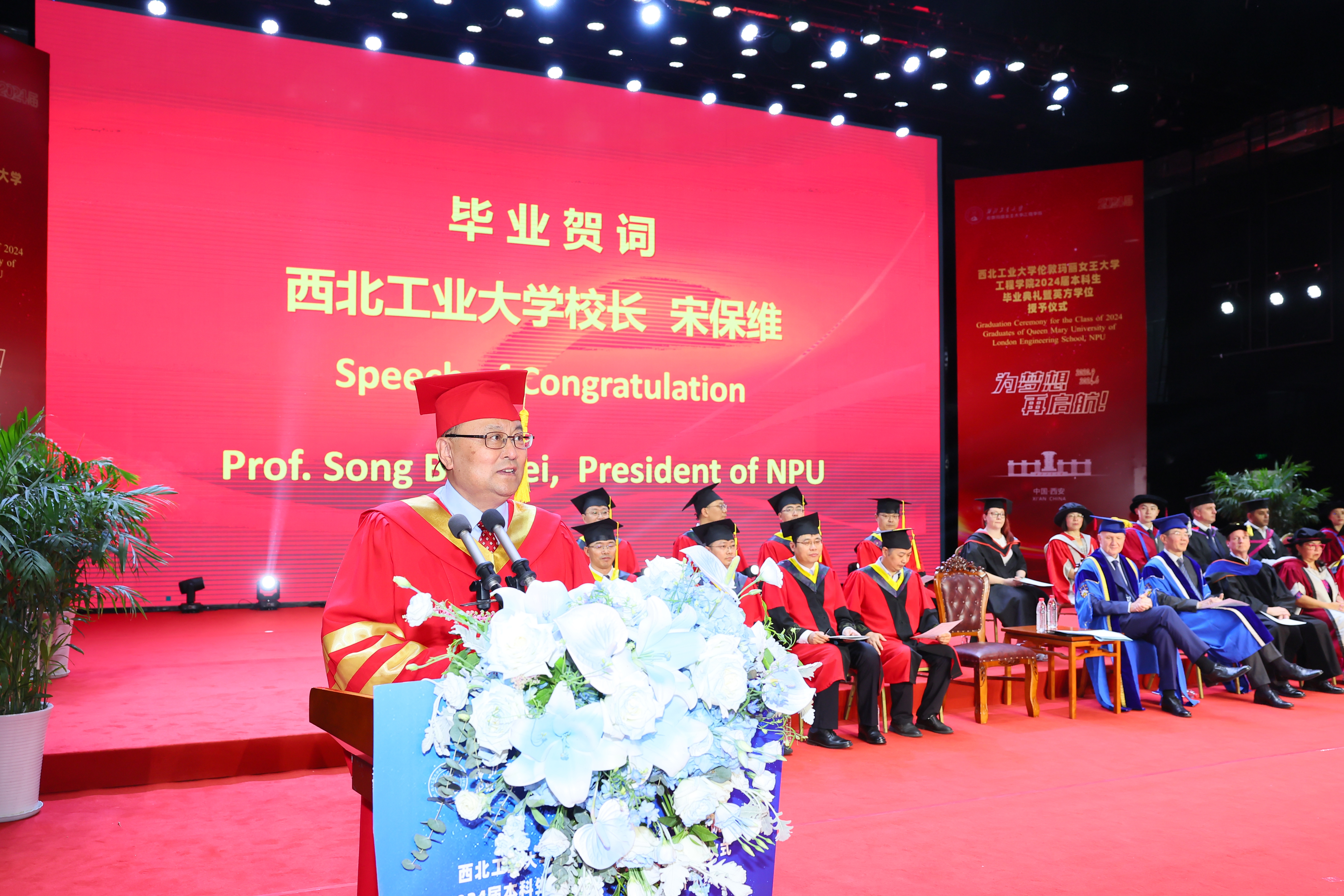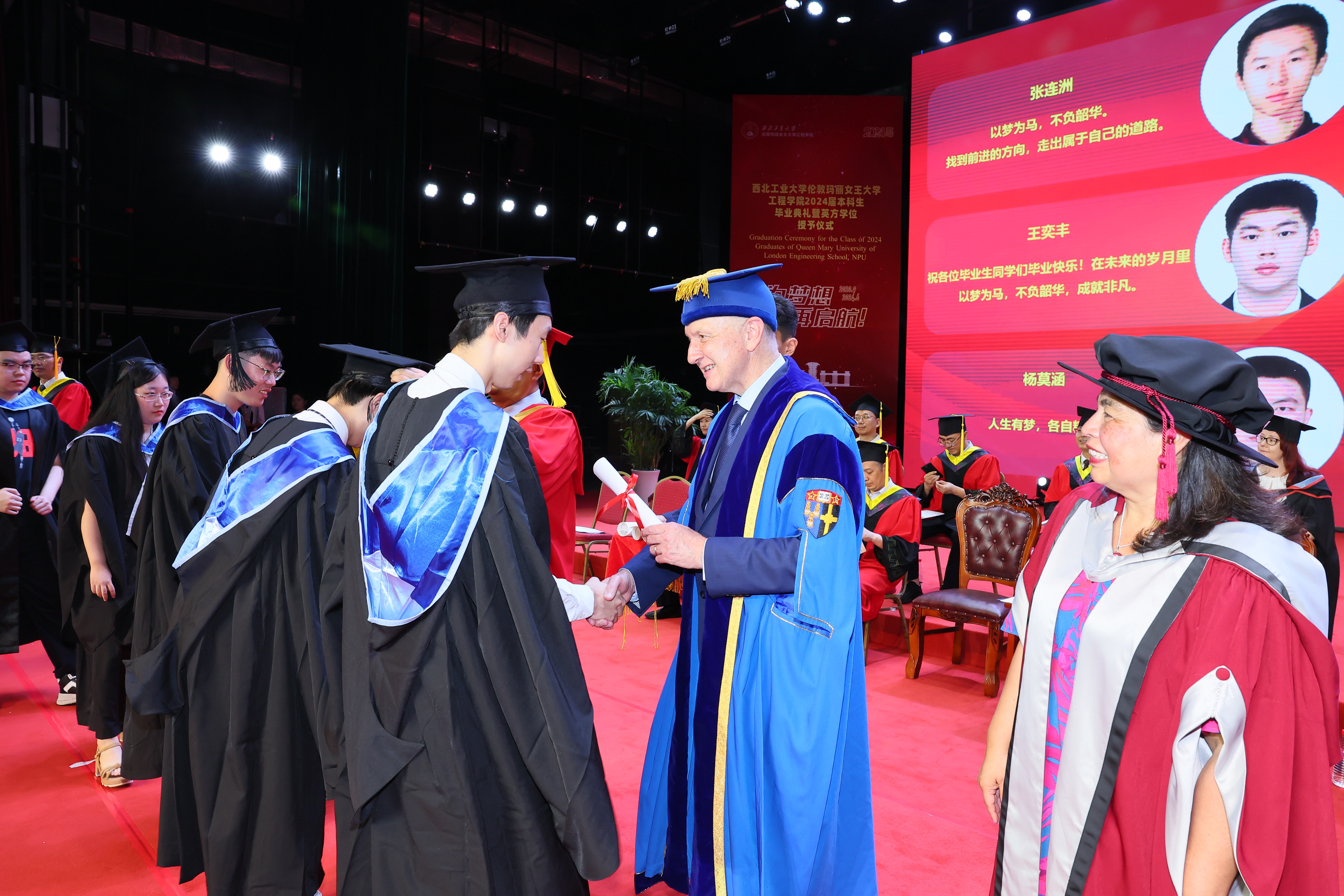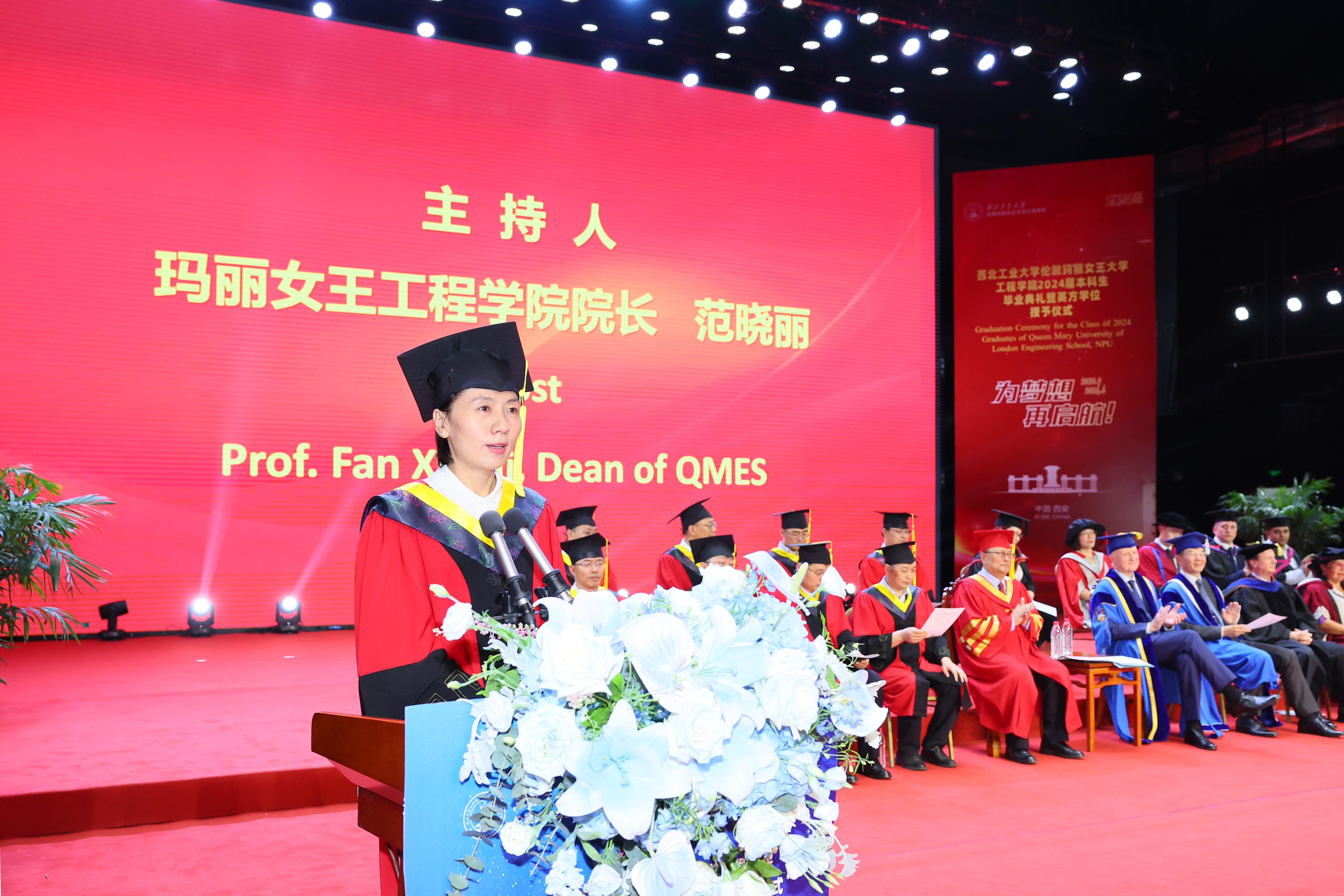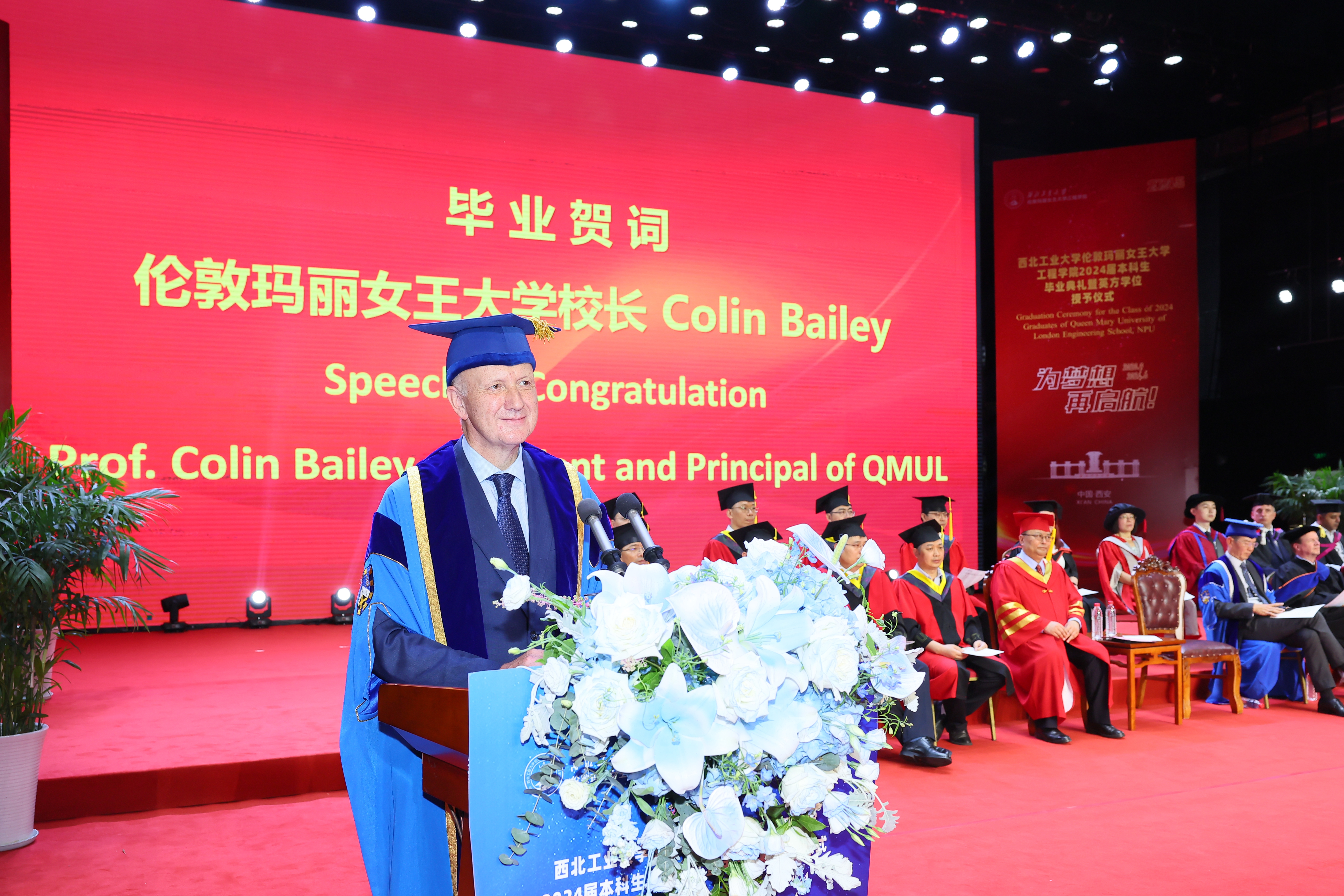 6 月 21 日,西北工业大学伦敦玛丽女王大学工程学院 2024 届本科生毕业典礼暨英方学位授予仪式在长安校区隆重举行。西北工业大学校长宋保维,伦敦玛丽女王大学校长 Colin Bailey 出席毕业典礼并致辞。我校副校长詹浩,伦敦玛丽女王大学副校长王文,两校相关单位负责人,学院 2024 届全体毕业生及亲友代表参加活动,共同见证这一重要时刻。典礼由玛丽女王工程学院院长范晓丽主持。