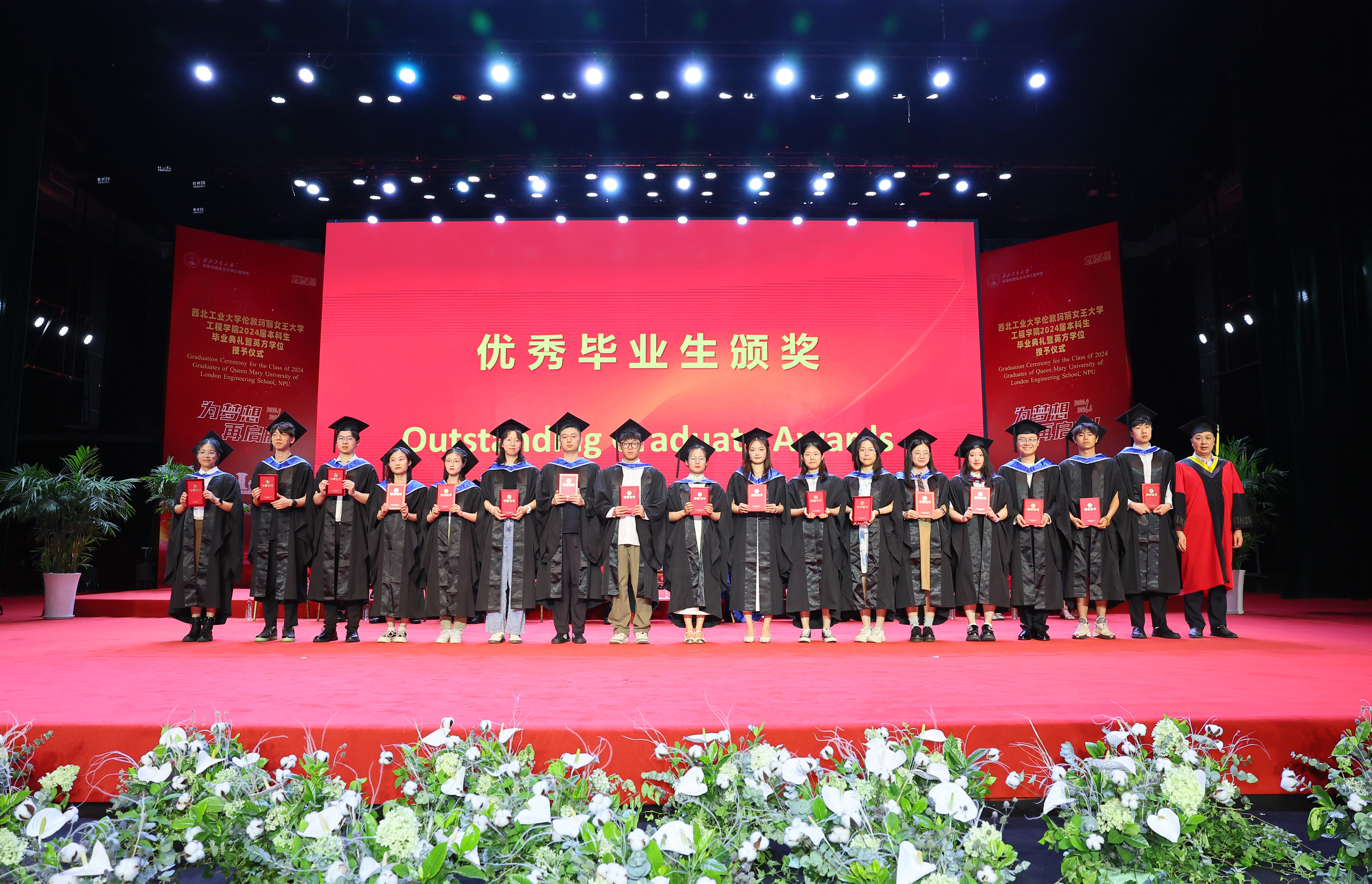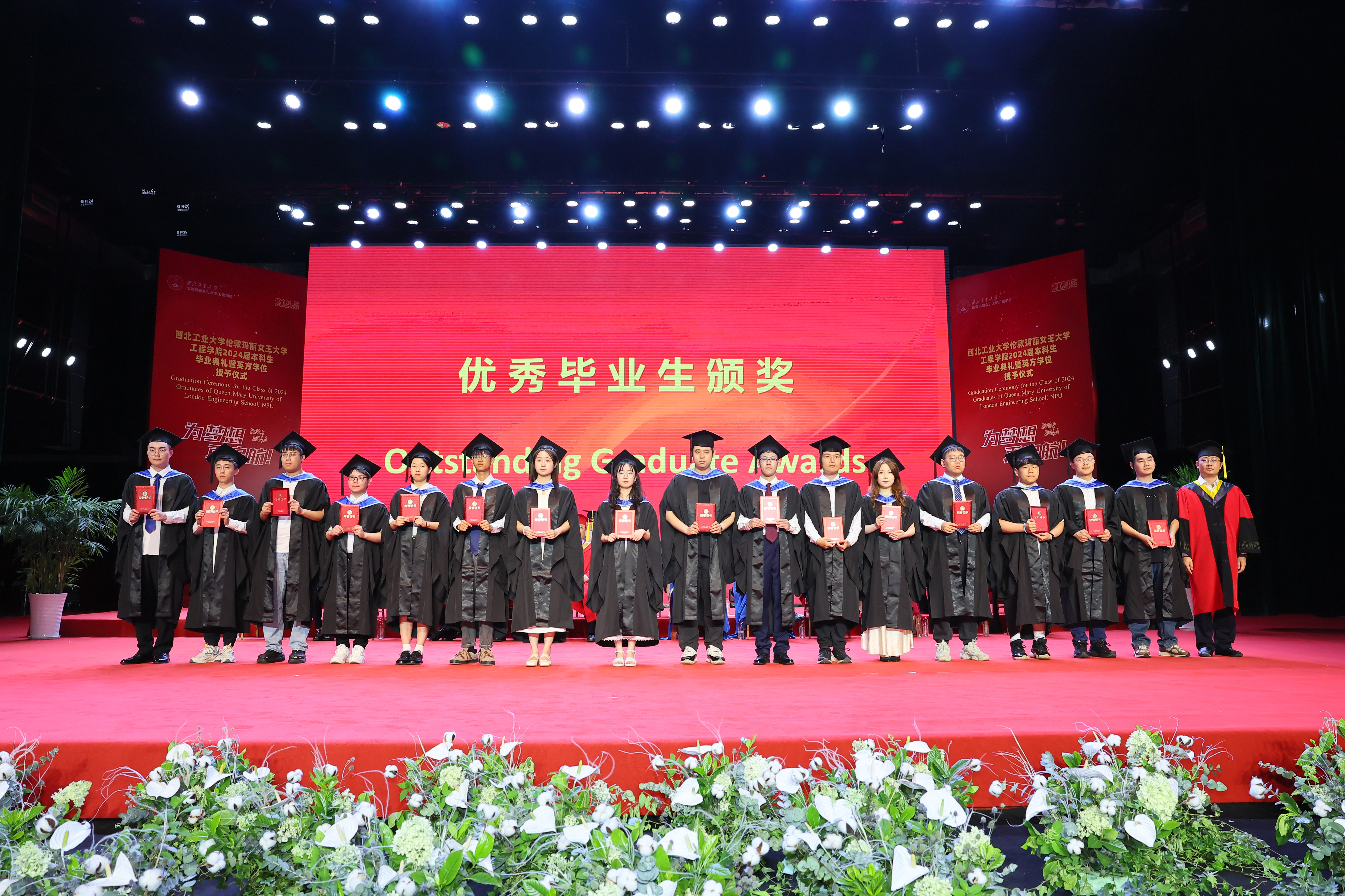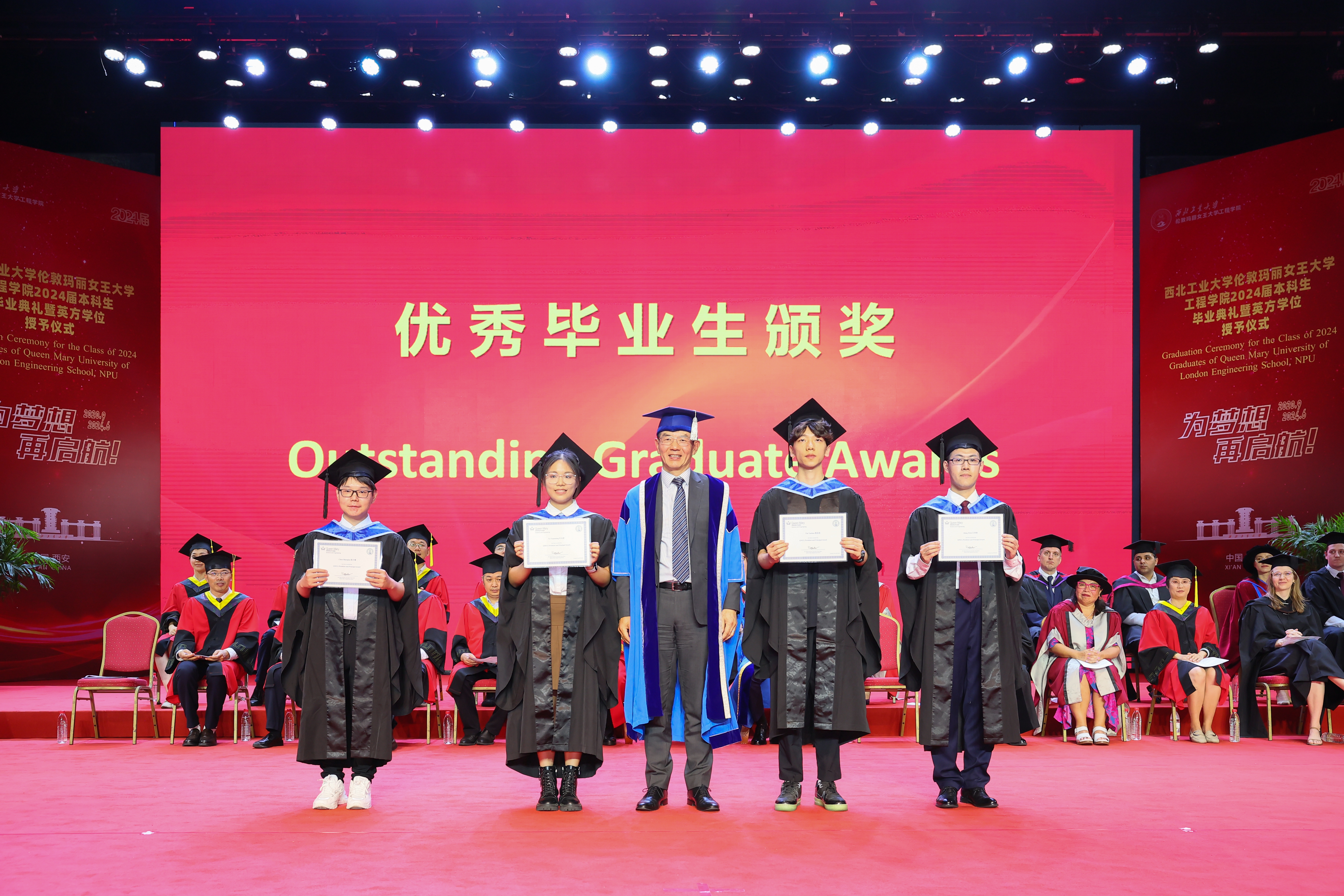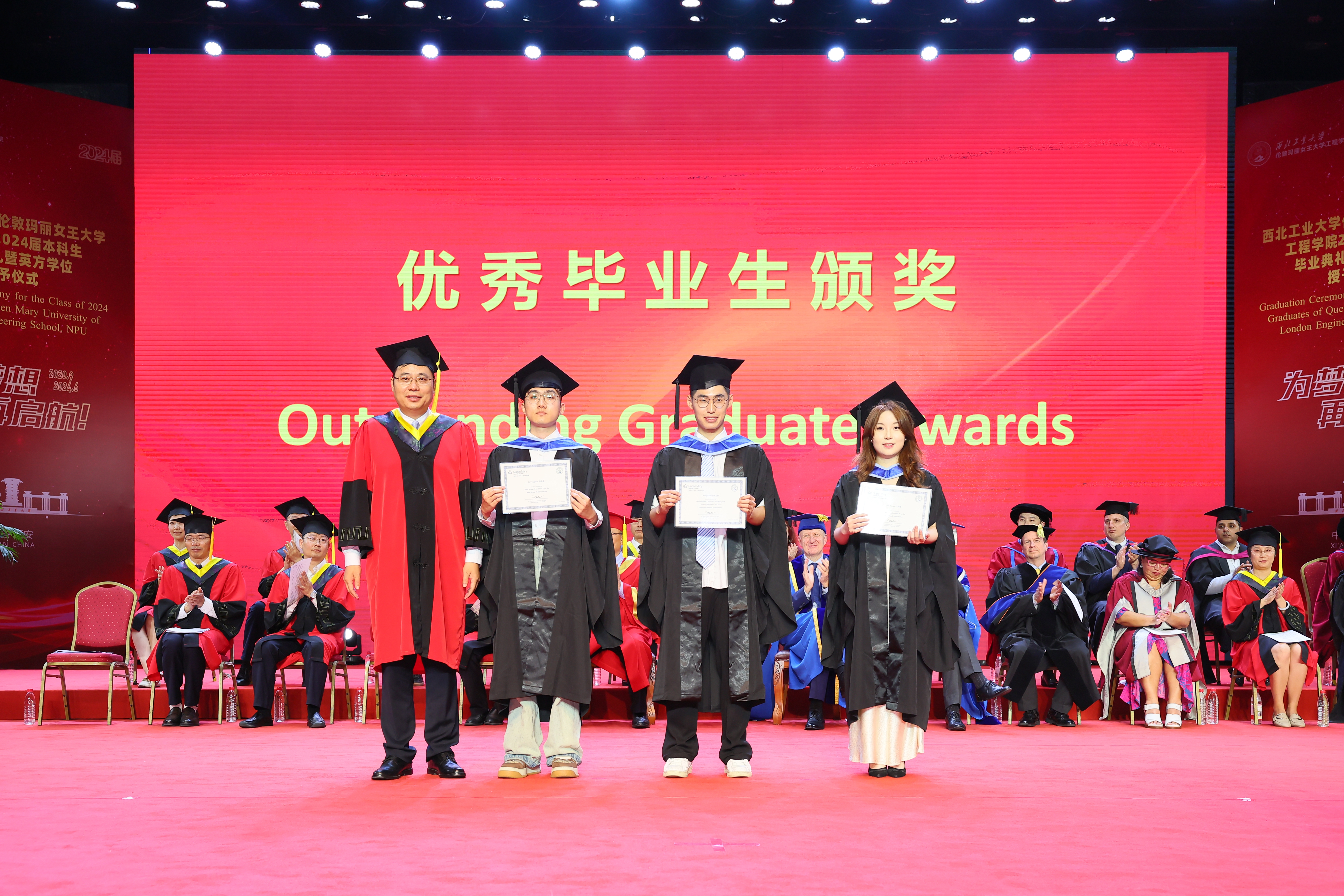 在两校的共同努力下,2024 届毕业生表现优异。王文为陈少骞、殷岳浩、叶元茗、江梓歆同学颁发伦敦玛丽女王大学校长奖荣誉证书;西工大国际合作处处长孔杰为孙语遥、李丰源同学颁发最佳论文奖荣誉证书,为张志伟同学颁发最佳进步奖荣誉证书;教务部部长王海鹏、校团委书记佘磊磊分别为薛垄琦、杨子涵、李昊等 33 名同学颁发西北工业大学优秀毕业生荣誉证书,对同学们在学业中取得的优异成绩表示祝贺。