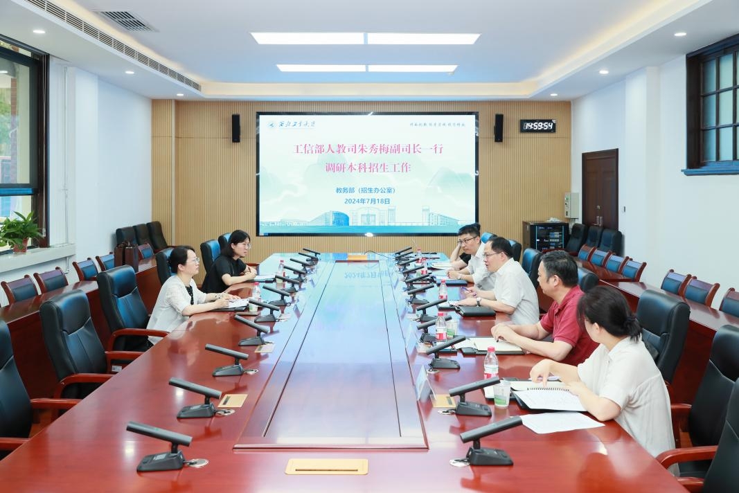 7月18日下午,工业和信息化部人事教育司副司长朱秀梅一行到我校调研本科招生工作。副校长杨益新、教务部部长王海鹏、招生办公室主任兼教务部副部长王克勤、纪检监察机构第二纪检监察室主任王莹、招生办公室副主任马婷婷参加调研。